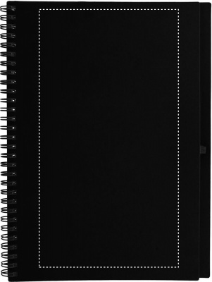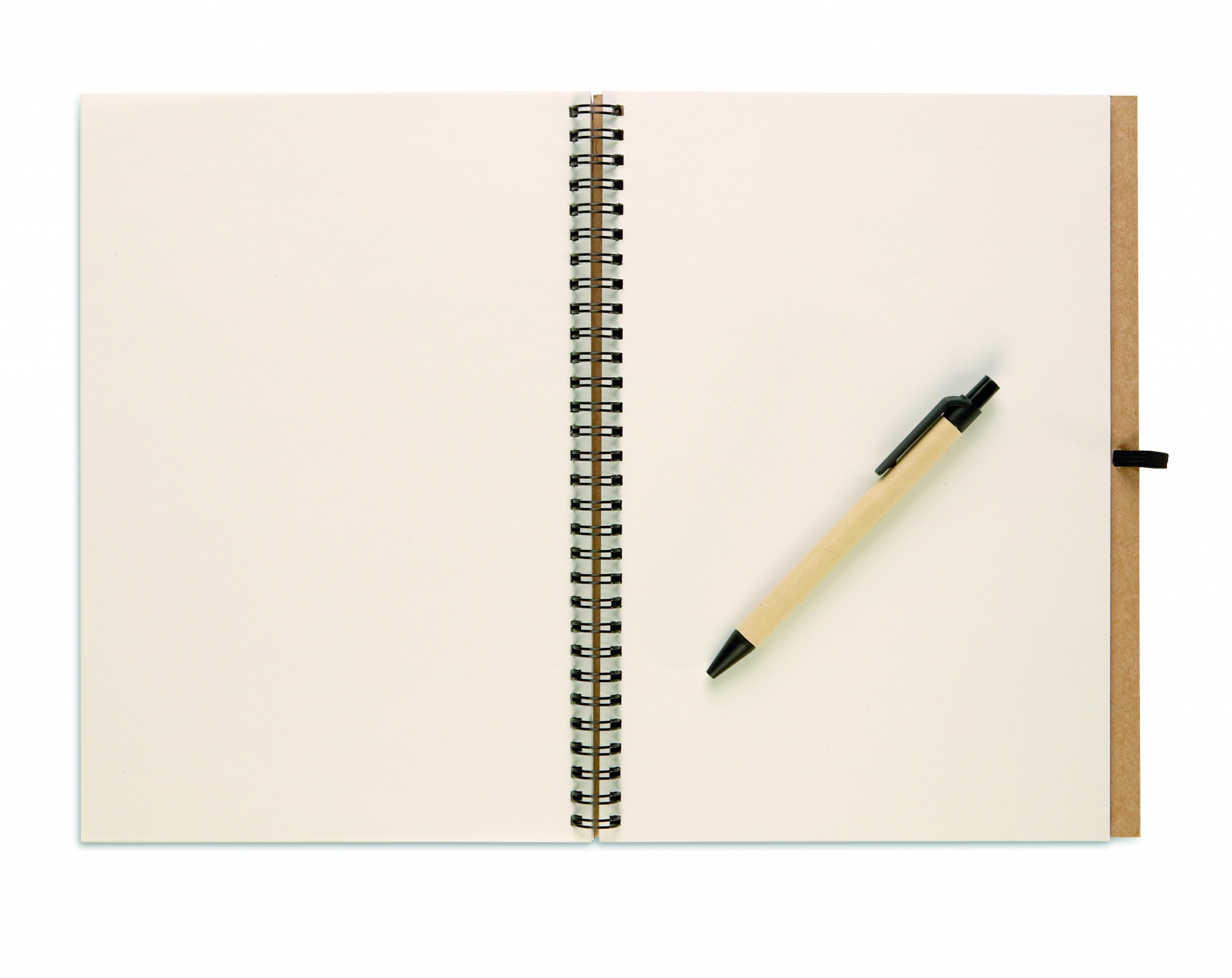 Recycled paper notebook with pen. Twin-wire. 140 plain recycled paper pages (70 sheets). Push button ball pen in recycled carton and biodegradable plastic. Blue ink. Black elastic pen holder.