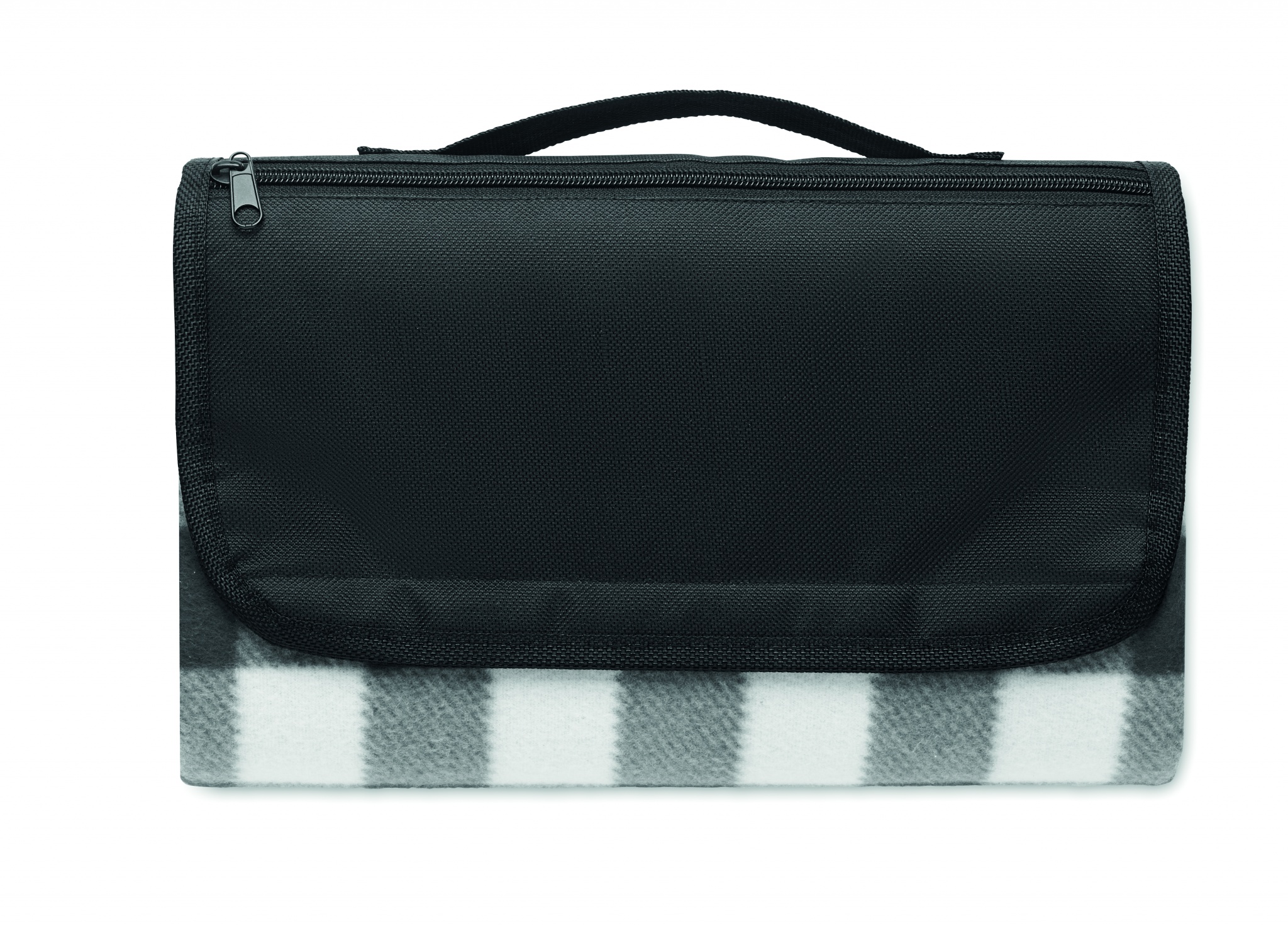 Foldable RPET 150 gr/m² polar fleece picnic blanket with water resistant coated PEVA reverse side. Includes a front zipper pocket and short carry strap.