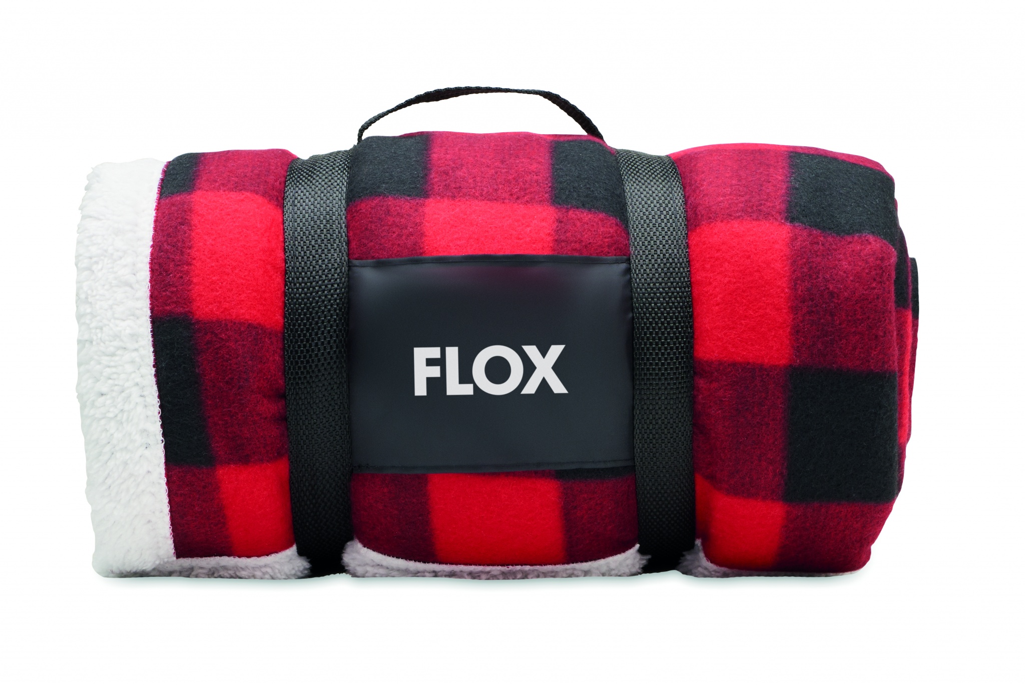Sherpa lined fleece blanket in RPET polar fleece (180 gr/m²) and polyester sherpa (230 gr/m²). Presented in an RPET nylon carry handle.