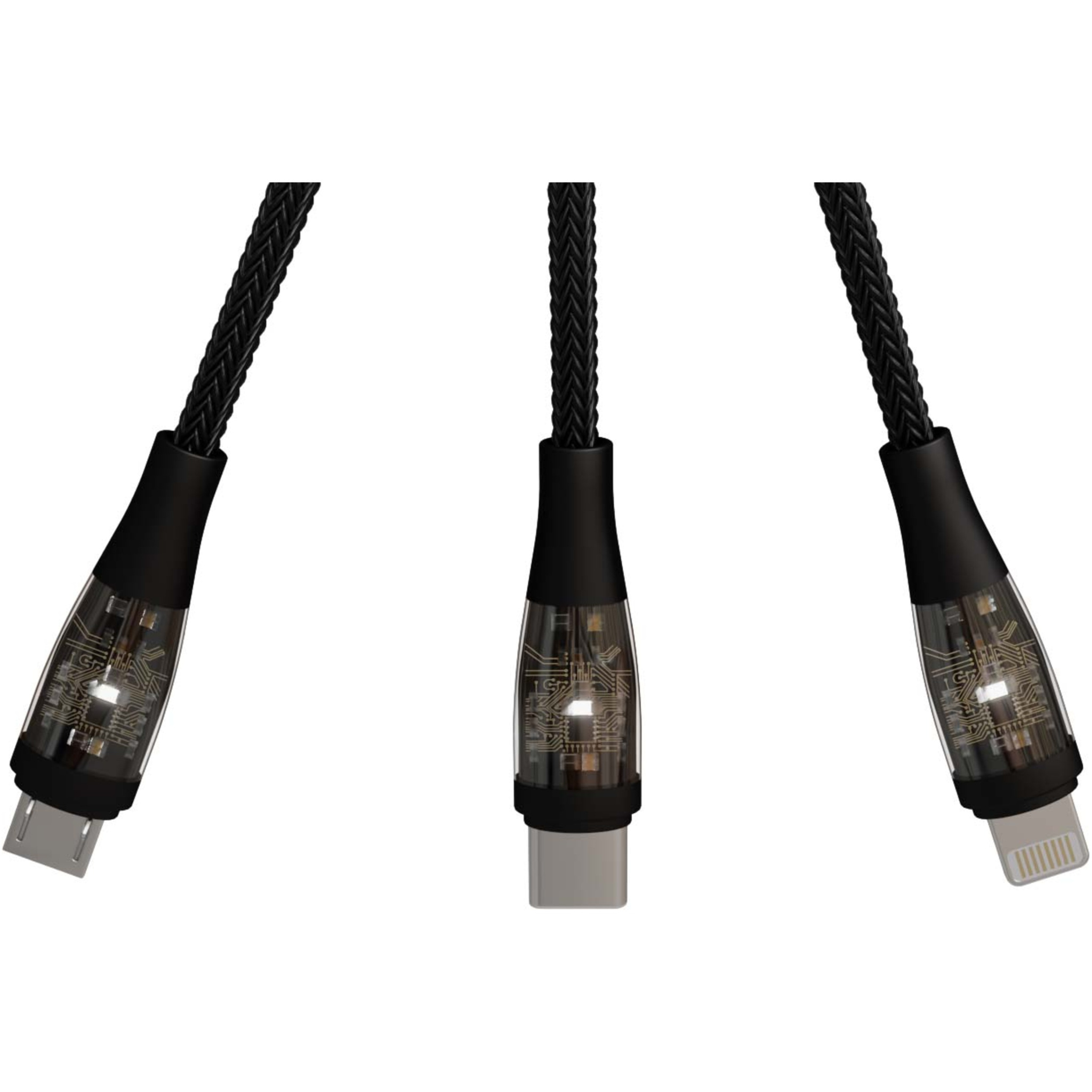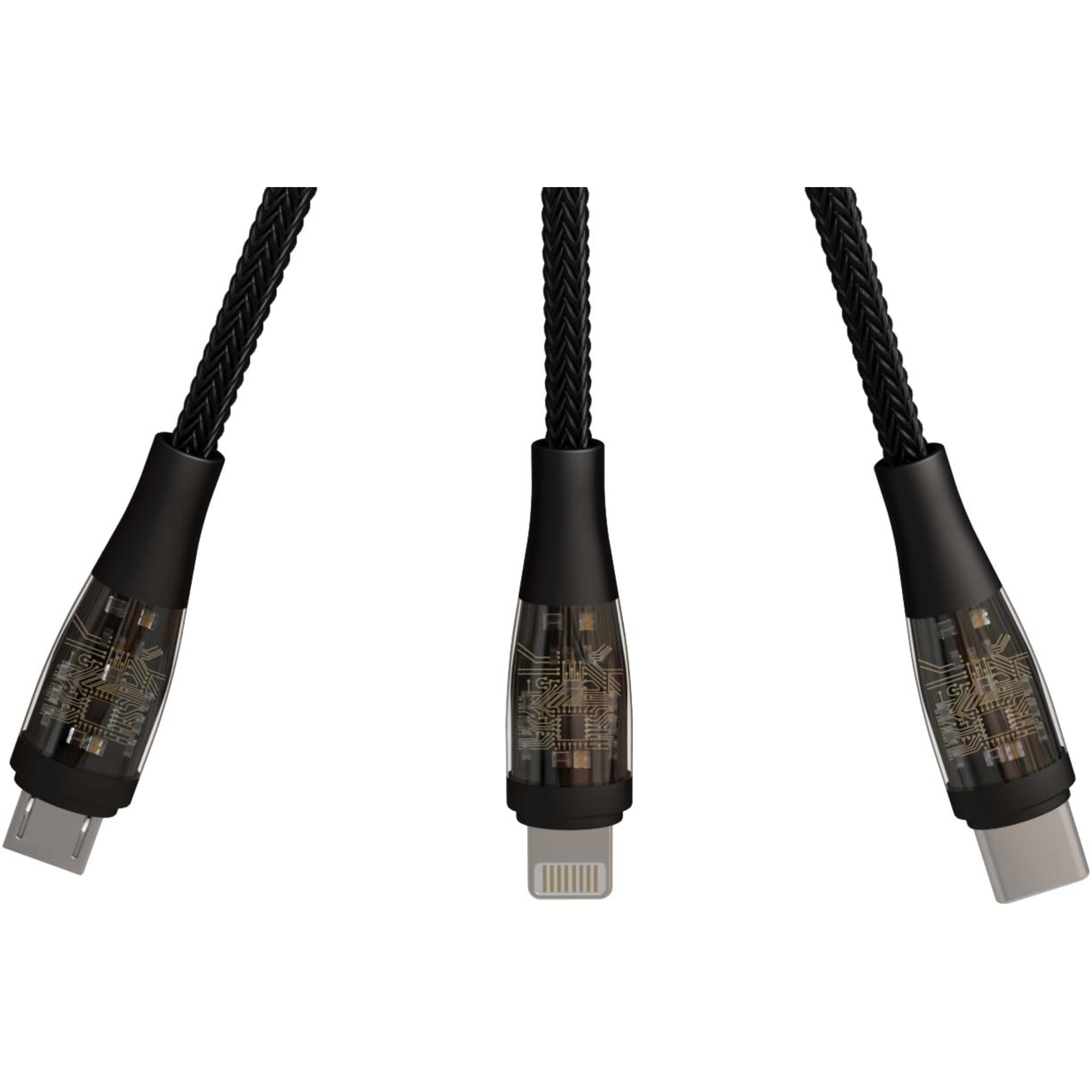 5-in-1 fast charging and data transfer cable. Input: USB-A/USB-C. Output: Micro USB/Type-C/Lightning. Fast charging: 100W/5A. Transparent plugs. Digital display with transfer speed at the front and light-up logo at the back.