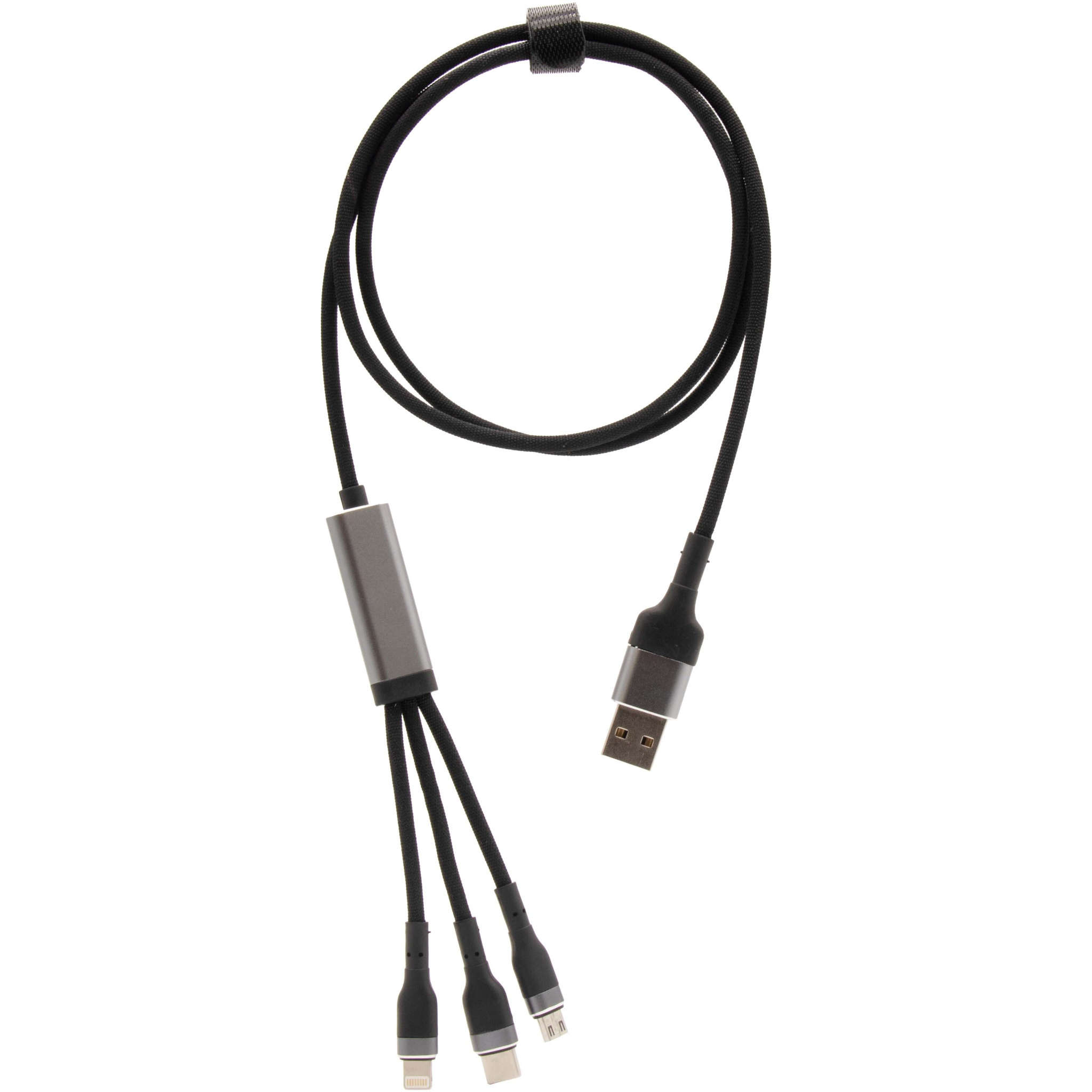 5-in-1 ultra-fast rPET 100W ultra fast charging cable that can charge smartphones, tablets and laptops. The dual USB-A + USB-C input makes the cable 100% compatible with the latest computer models. Output: Type-C, Micro USB, and Lightning. Delivered with recyclable TPU pouch and a recycled paper insert. Cable length: 1 metre.