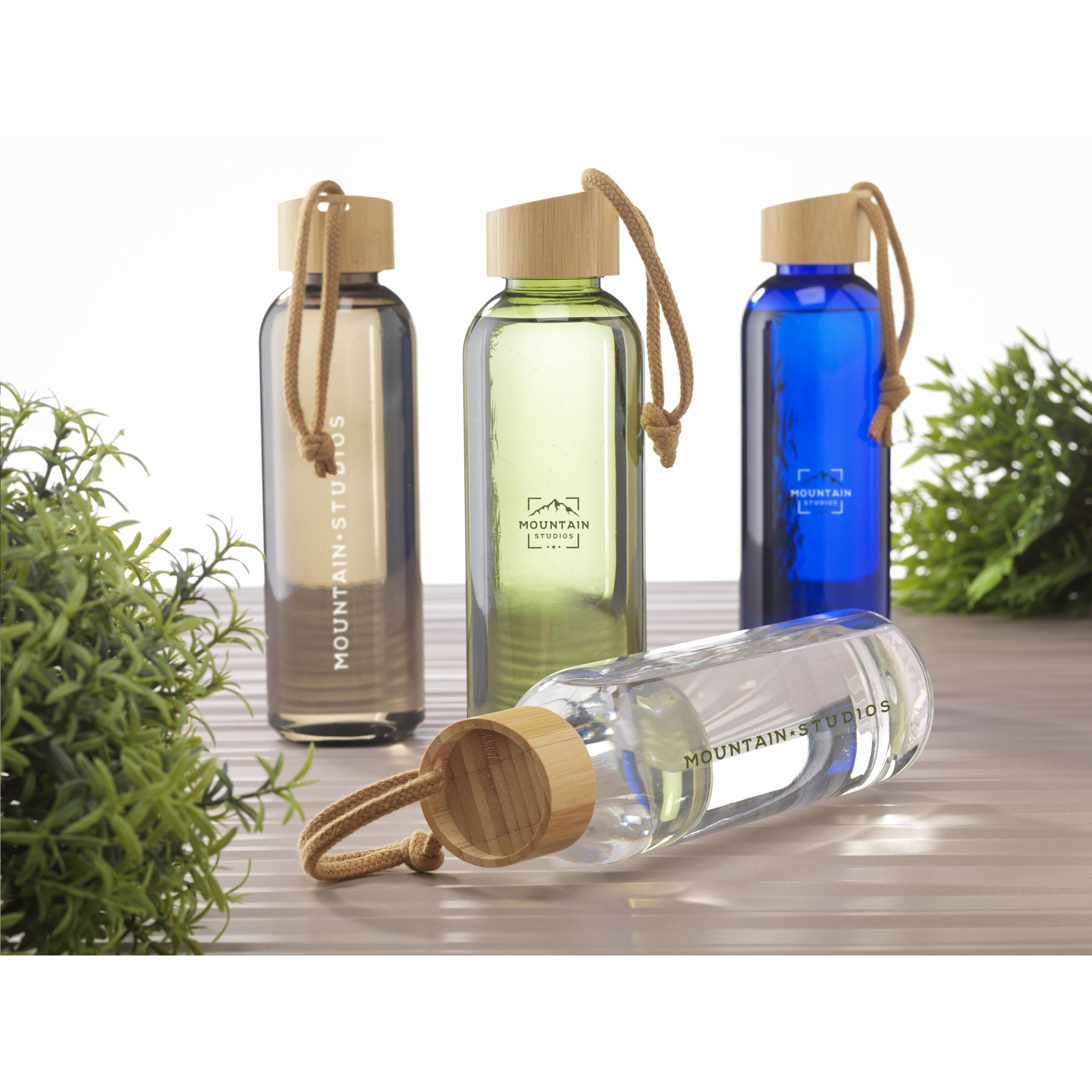 WoW! Reusable, recycled water bottle. The body is made from 100% RPET. With leak proof bamboo screw cap to which a handy carrying cord is attached. The slim design is particularly comfortable to hold. Not dishwasher-safe. GRS-certified. Total recycled material: 73%. Capacity 680 ml.