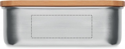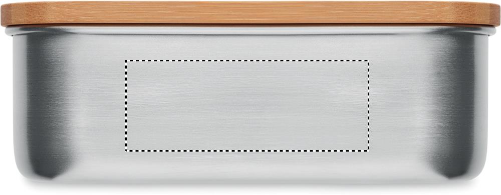 Stainless Steel lunch box with bamboo lid and 2 cutlery utensils with attachable polyester band. Capacity 600ml. Bamboo is a natural product, there may be slight variations in colour and size per item, which can affect the final decoration outcome.