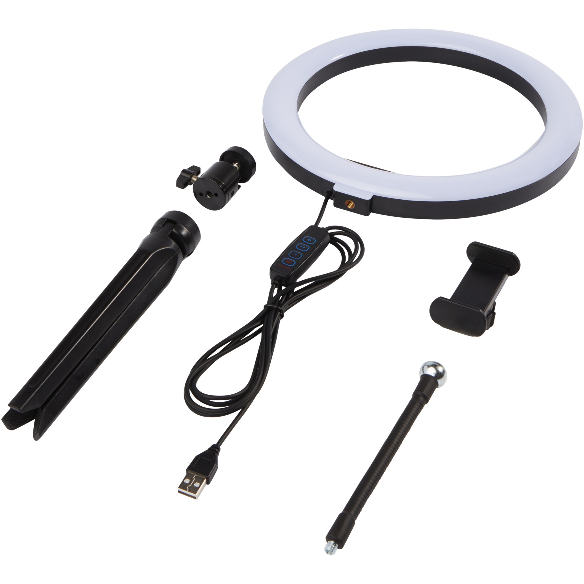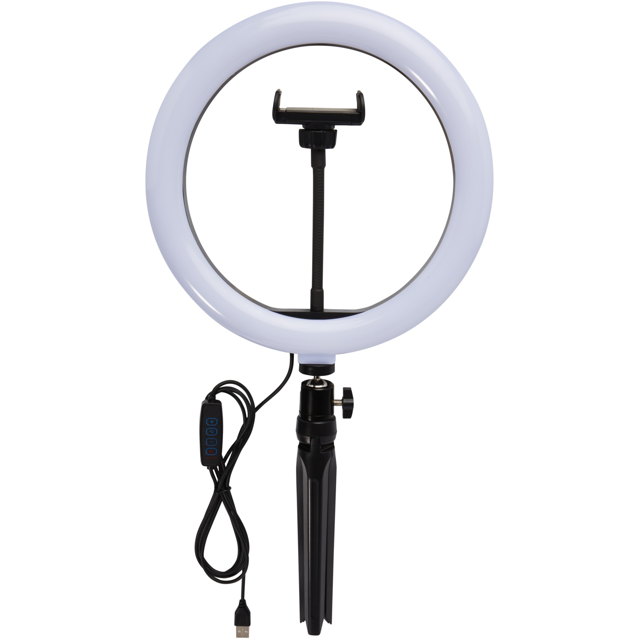 LED ring light (23 cm) with a tripod stand and phone holder, the ideal gadget for any photographer/YouTuber/Vlogger/content creator that regularly do streams or broadcasts. The ring light will cast even light on your face without any hard shadows. The lamp has 120 warm white LEDs that can be adjusted to 10 different brightness levels for the perfect light exposure. Delivered in an Avenue gift box.