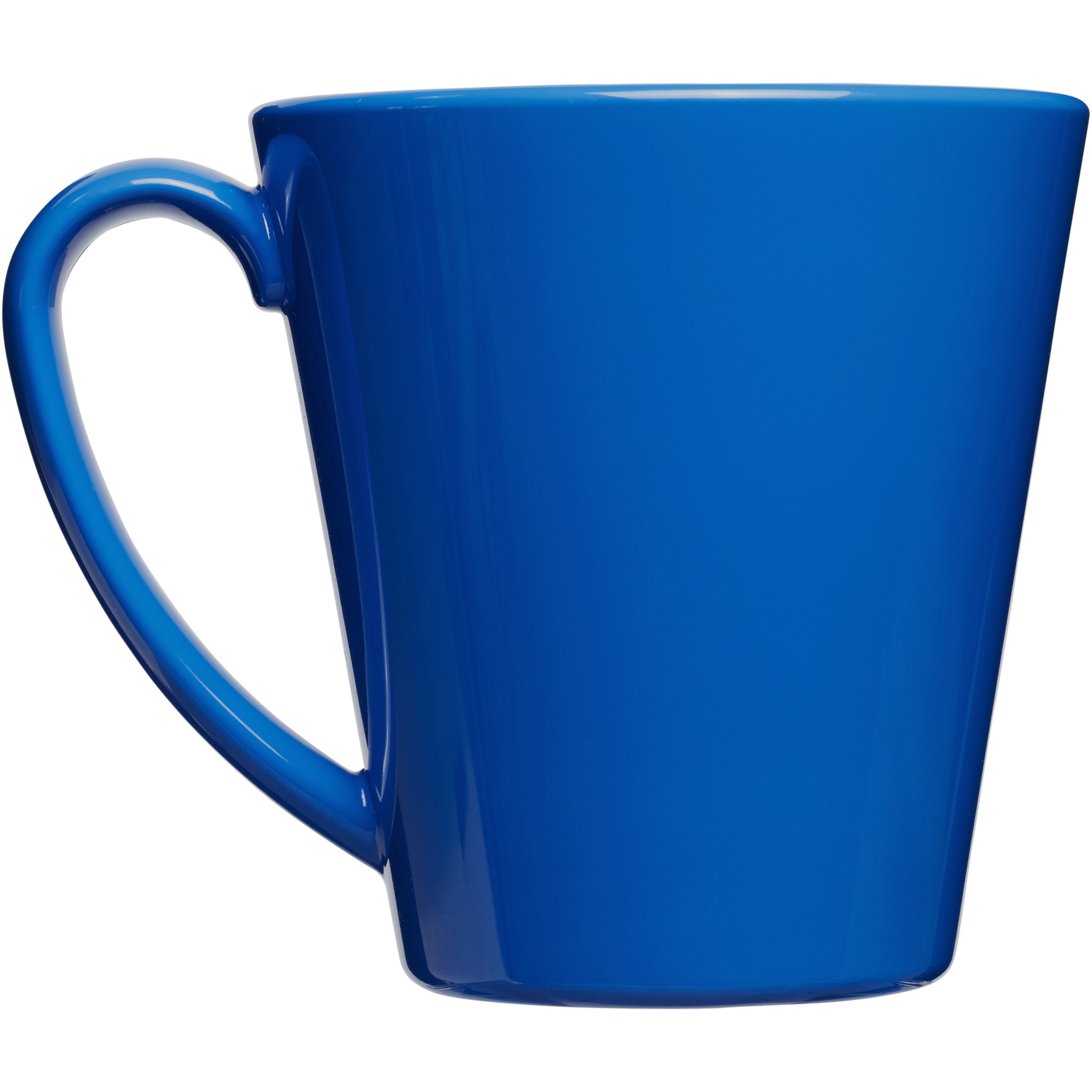 Durable, single-wall plastic mug. Volume capacity is 350 ml. Made in the UK.