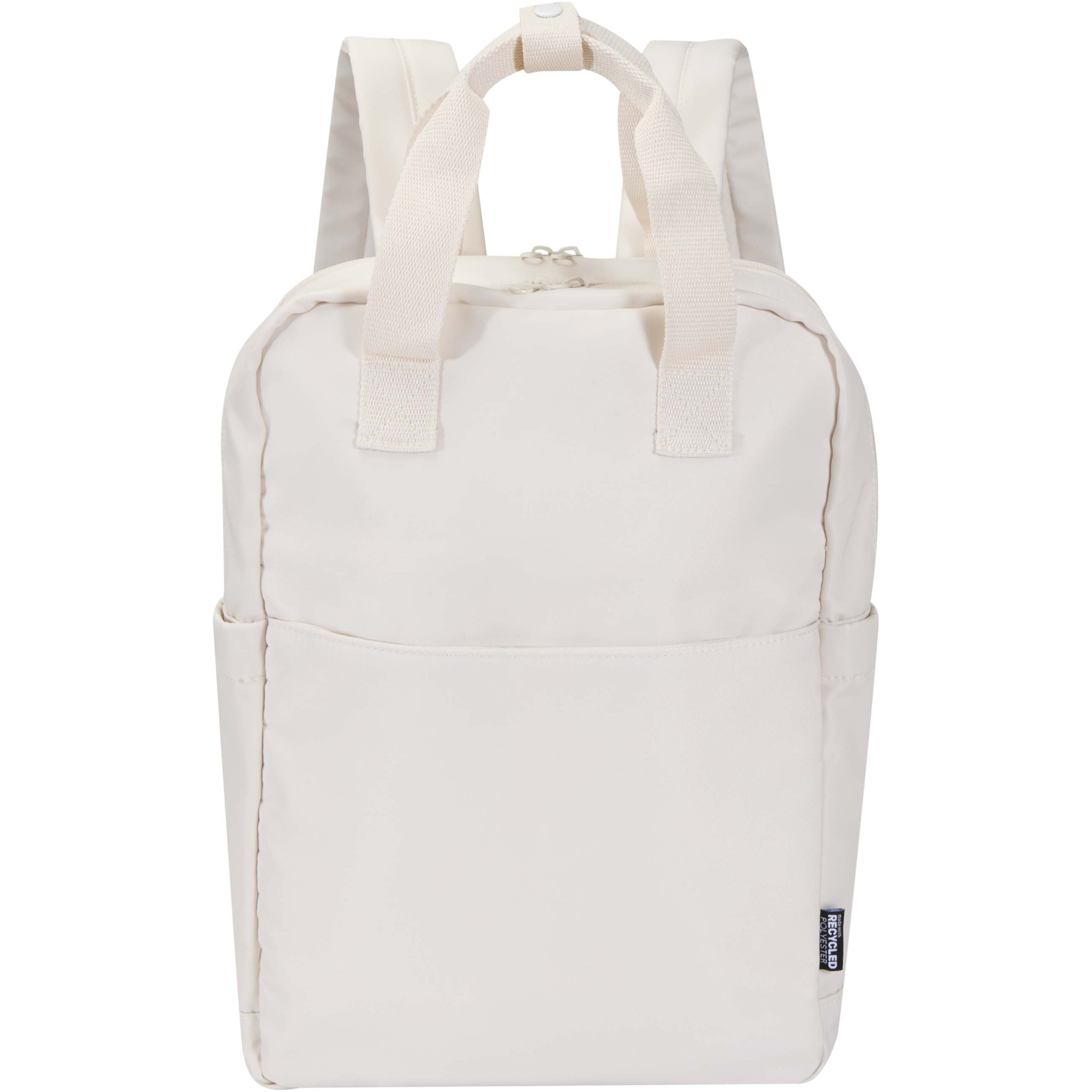 The Trip Aware™ recycled travel laptop backpack is a compact, lightweight backpack designed for streamlined travel and everyday use. Made from durable 290D twill polyester with a soft knitted backing and lined with RPET 210D/PU, it combines functionality with a clean, practical design. It features two side pockets for water bottles, dual carry handles, and comfortable shoulder straps. The front zip pocket includes organised storage for a passport, pens, and a ribbon for keys, while the main compartment fits a notebook or tablet. A separate 14” laptop compartment and a trolley sleeve on the back make it especially suitable for travel. Each bag also comes with an Aware™ tracer. This innovative feature allows users to trace the origins and journey of their item through a QR code, enhancing transparency in the supply chain and fostering a stronger connection between the product and its production process. Volume capacity: 9 litres.