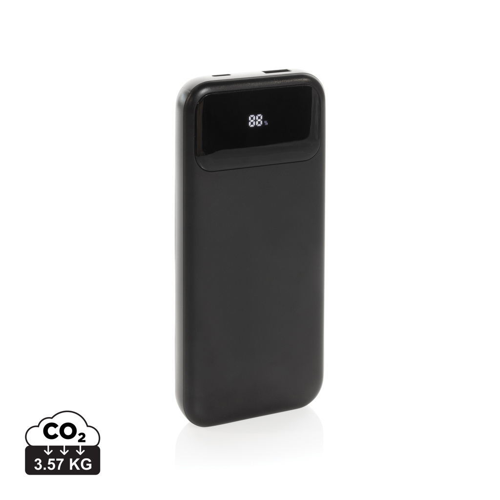 All in one fast charge powerbank with integrated cables and power display. The 10,000 mah powerbank comes with an integrated type C and integrated Apple Lightning cable so that you can easily connect to your device to start fast charging your mobile device. With one additional type C port and USB A port to connect your own charging cable. When fully charged the powerbank provides you with enough energy to re-charge your mobile phone up to four times. The powerbank contains a long lasting grade A 10.000 mAh lithium polymer battery. Made with recycled ABS and recycled TPE. Total recycled content: 21% based on total item weight. RCS certification ensures a completely certified supply chain of the recycled materials. With digital display to show the remaining power. Packed in FSC® kraft packaging. PVC Free. USB-A output 5V⎓3.0A, 9V⎓2A, 12V⎓1.5A; USB-C output 5V⎓3.0A, 9V⎓2.22A, 12V⎓1.67; Type-C input 5V⎓3.0A, 9V⎓2A, 12V⎓1.5A; Built-in USB-C cable Output: 5V⎓3A 9V⎓2A 12V⎓ 1.5A;