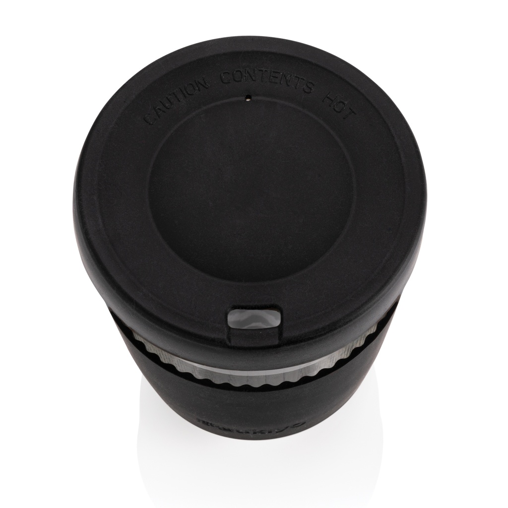 Enjoy your coffee at work or at home in this Ukiyo borosilicate glass with silicone lid and sleeve. The cup has a nice grip and a slim shape. A small vent in the lid allows steam to escape to prevent pressure build-up. BPA free. Capacity 360ml.
