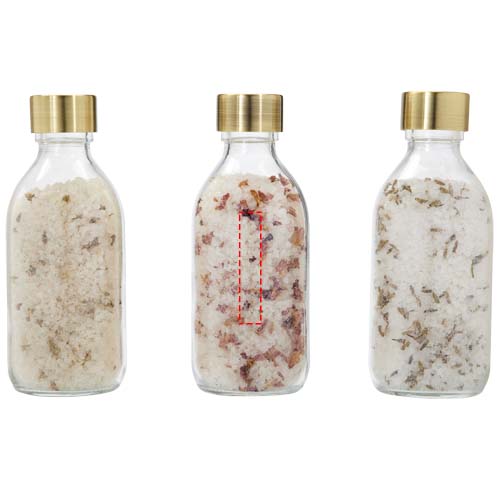 Gift set "Just Relax' with 3x 200 ml of bath salt from the Dead Sea in a clear glass bottle with steel cap in brass colour. Each bottle has a different scent: Roses, Lavender and Camomile. No bath at home? The bath salt can also be used to refresh and relax tired feet. The perfect gift for every occasion for an affordable price. Made in the Netherlands.