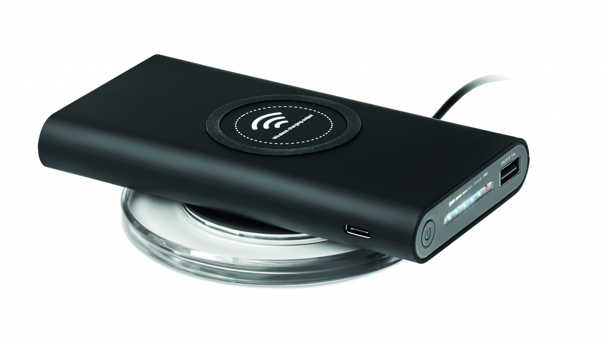 Wireless charging power bank with 8000 mAh capacity. Power bank can be charge by cable or wireless charging. Includes Type C connector. Powerbank output DC5V/2.1A. Wireless output: DC5V/1A. Wireless receiving: DC5V/0.75A Compatible latest androids, iPhone® 8, X and newer.