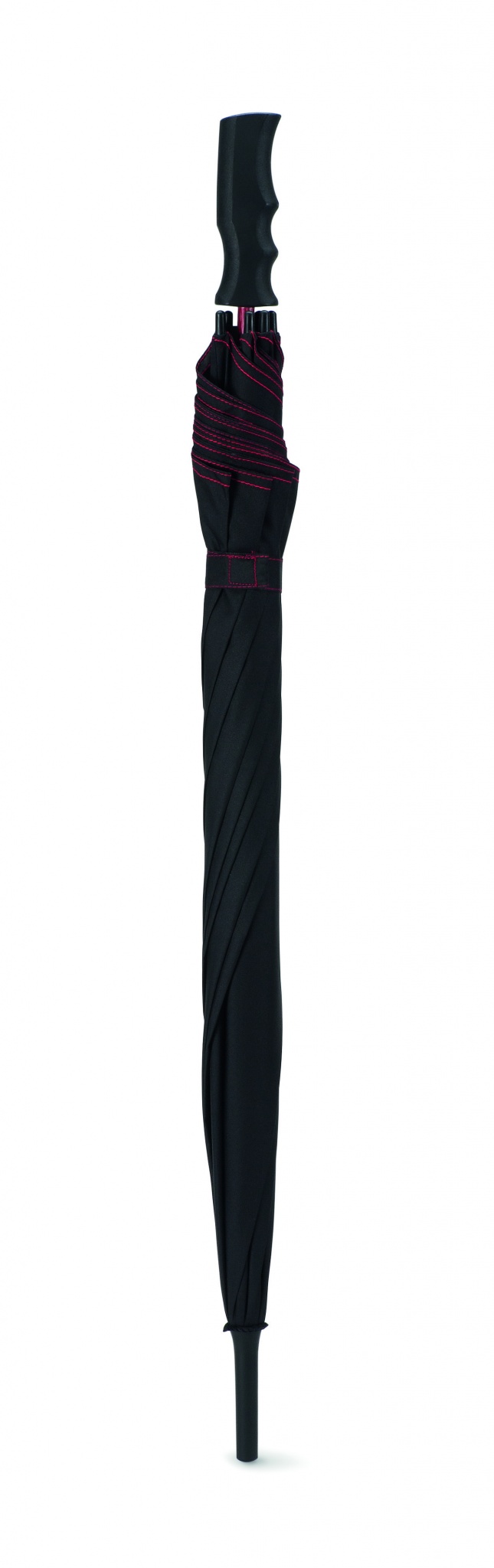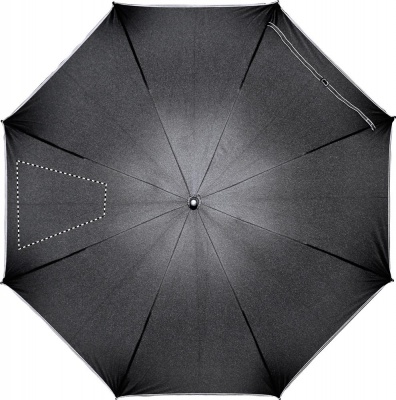 23-tolline automaatselt avatav tuulekindel vihmavari 190T pongee klaaskiust varre ja mustade plastikotstega ribidega. Musta värvi paneelid sobivat värvi õmblustega. Sirge must plastikust käepide. Käsitsi sulgemine.