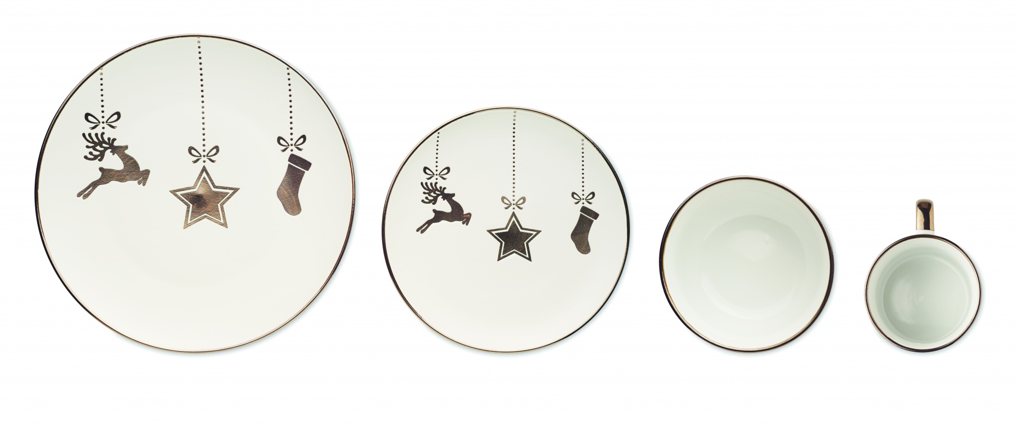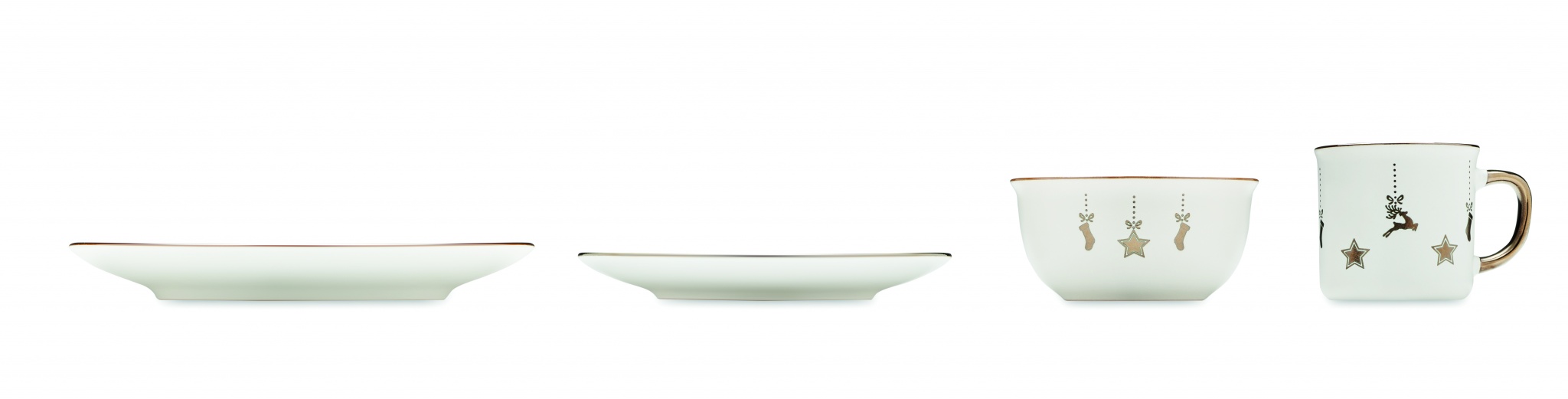4-osaline keraamiline jõuluseade. Sisaldab: õhtusöögitaldrik, hommikusöögitaldrik, teravilja-/salatikauss (500 ml) ja kruus (300 ml). Esitatakse kinkekarbis.