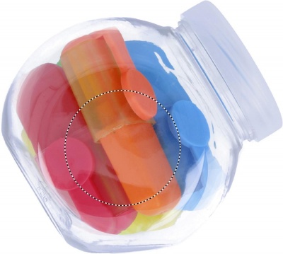 5 klambriga markerit väikeses läbipaistvas PET konteiner purgis.