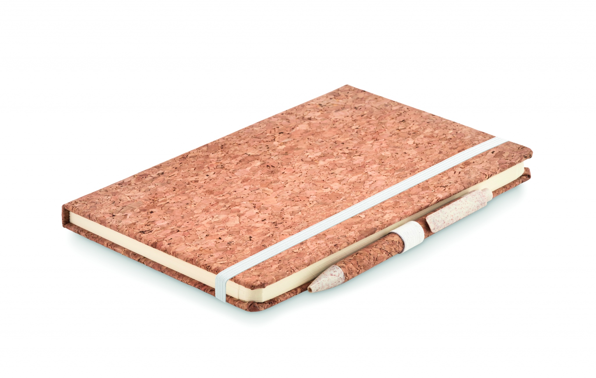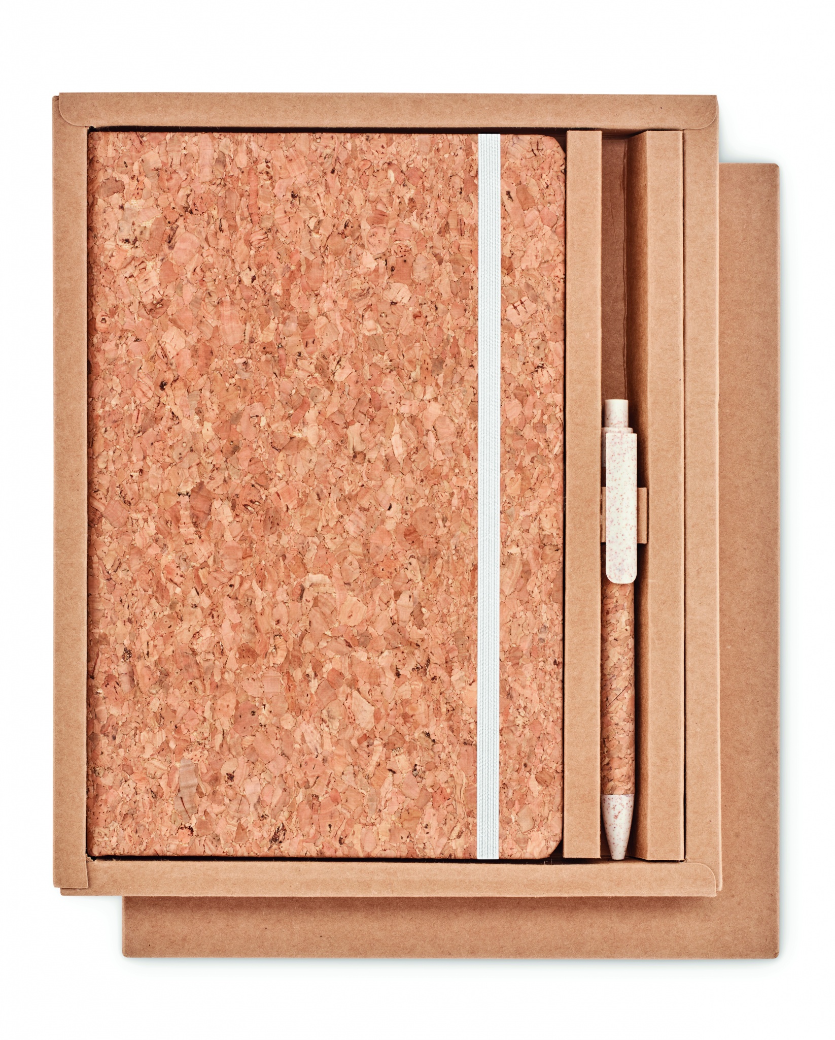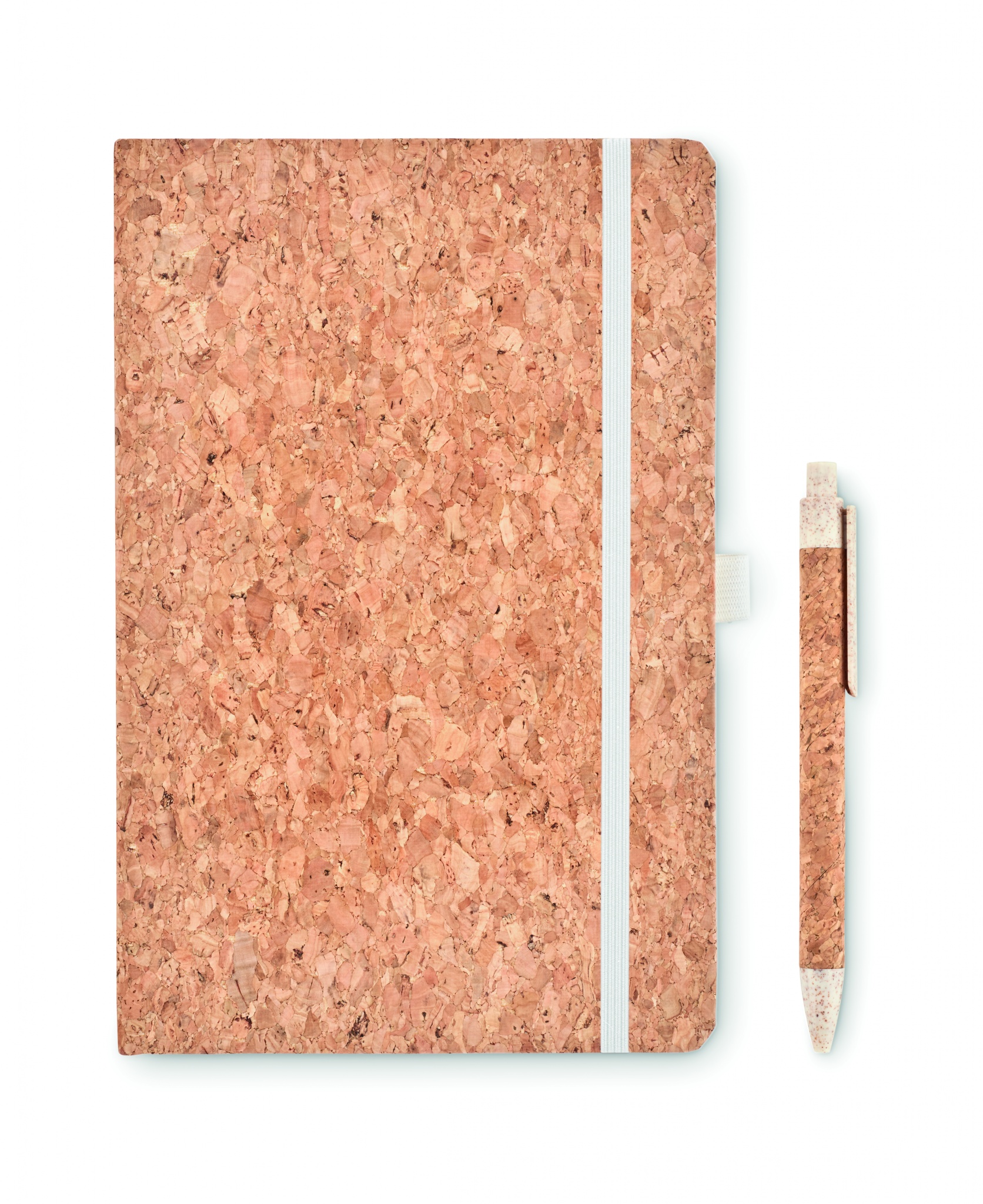 A5 korgist märkmik koos sobiva pliiatsiga. Kõva korgist kate. Casebound. 160 joonelist lehte (80 lehte). Elastne sulgemisrihm ja pliiatsihoidja. Sobiv nupust pastakas korgist tünniga ja 50% nisukõrtest ja 50% PP detailidest. Esitatakse kinkekarbis. Kork on 100% looduslik materjal. Selle struktuurse olemuse ja pinna poorsuse tõttu võib lõpptulemus eseme kohta esineda kõrvalekaldeid.