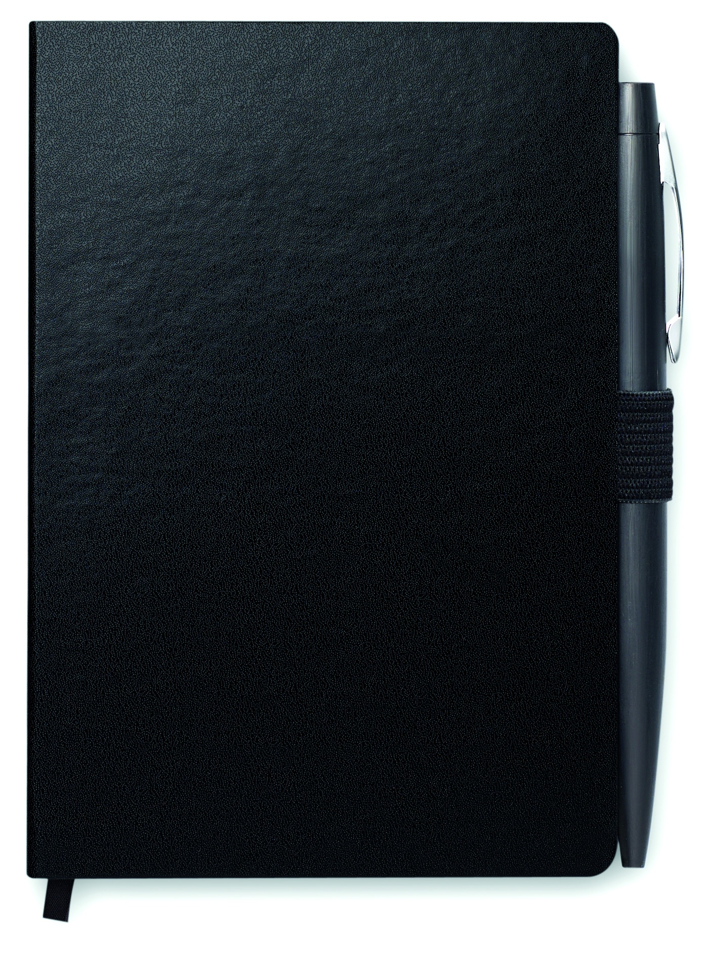 A6 märkmik pliiatsiga. Kõva PU kate. Casebound. 144 joonelist lehte (72 lehte). Sobiv elastne sulgemisrihm, lindiga järjehoidja ja pliiatsihoidja. Sobiv metallist nupust pastapliiats. Sinine tint.