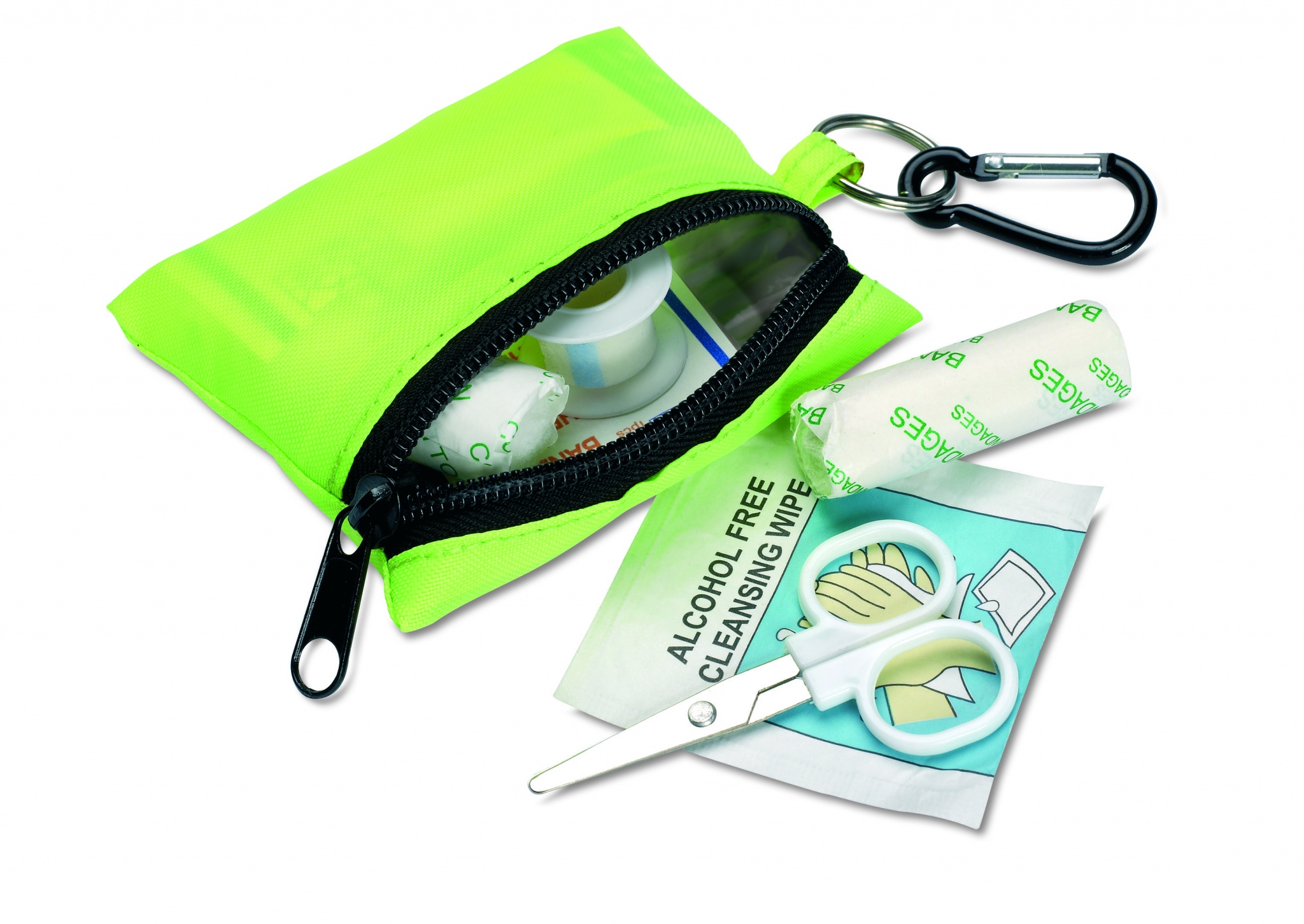 Esmaabikomplekt, mis sisaldab käärid, niiske salvrätik, marli side, 3 vatipulka ja 5 kleepuvat sidet. Kõik pakitud karabiiniga polüesterkotti.
