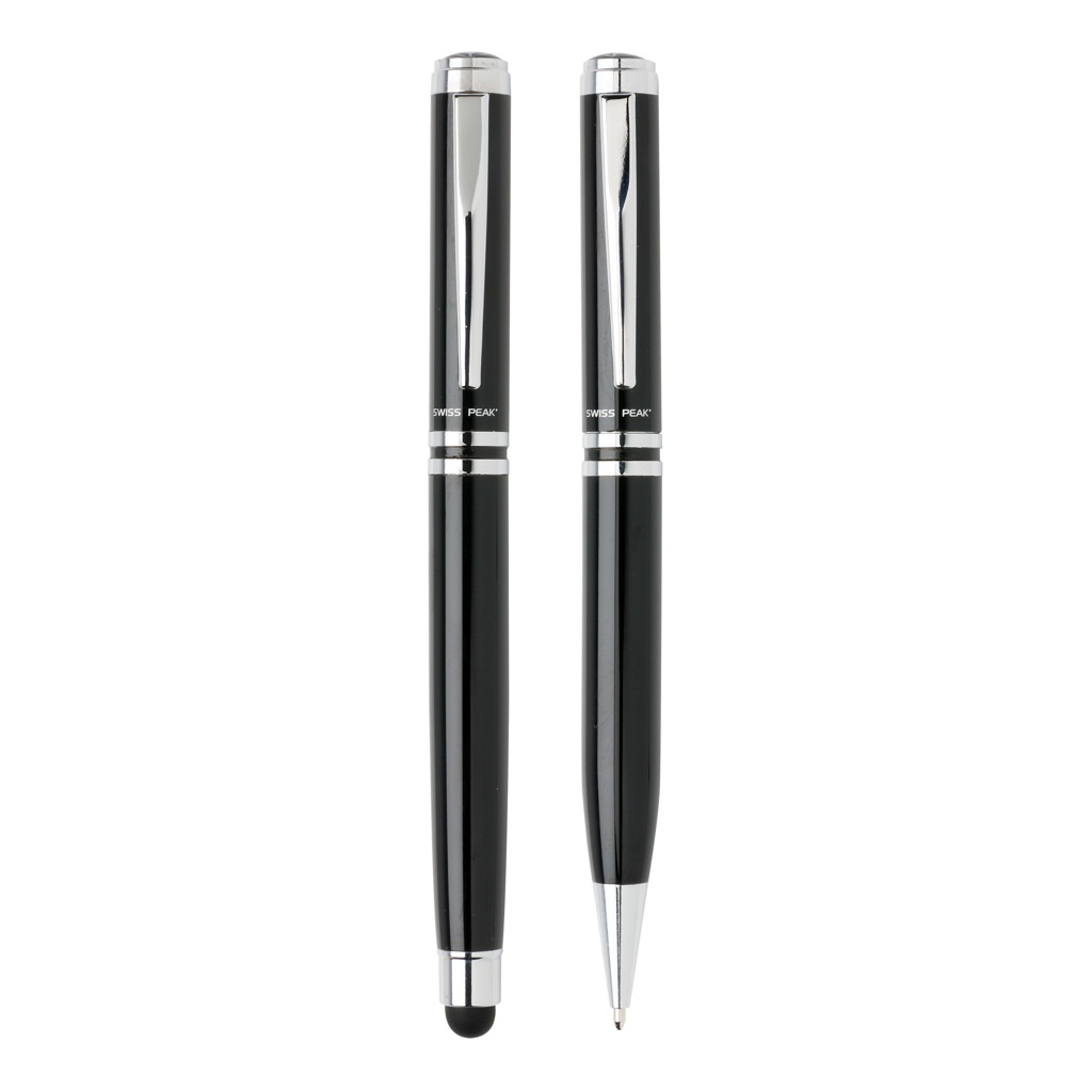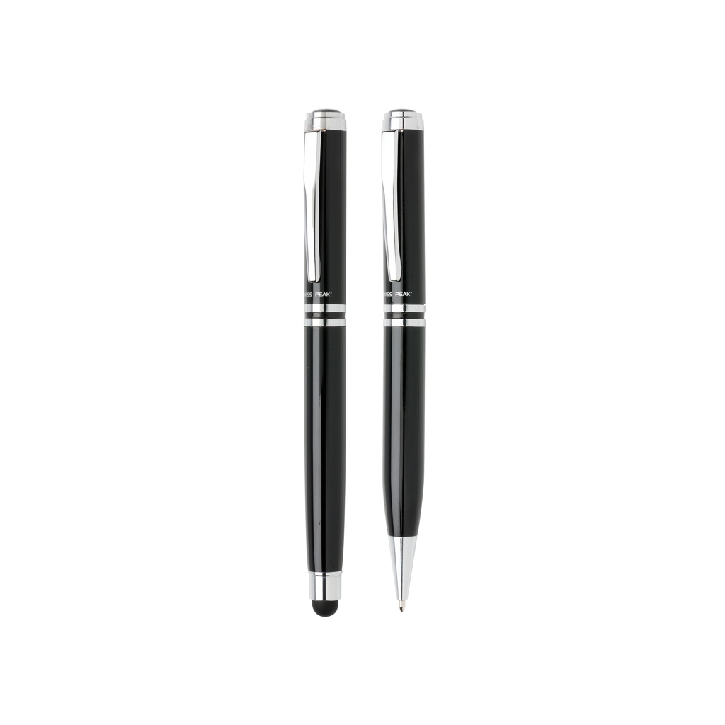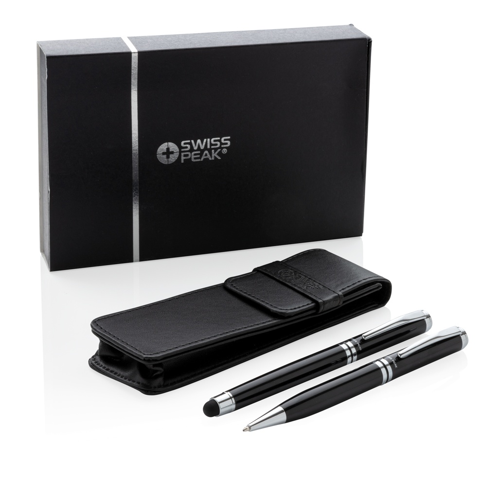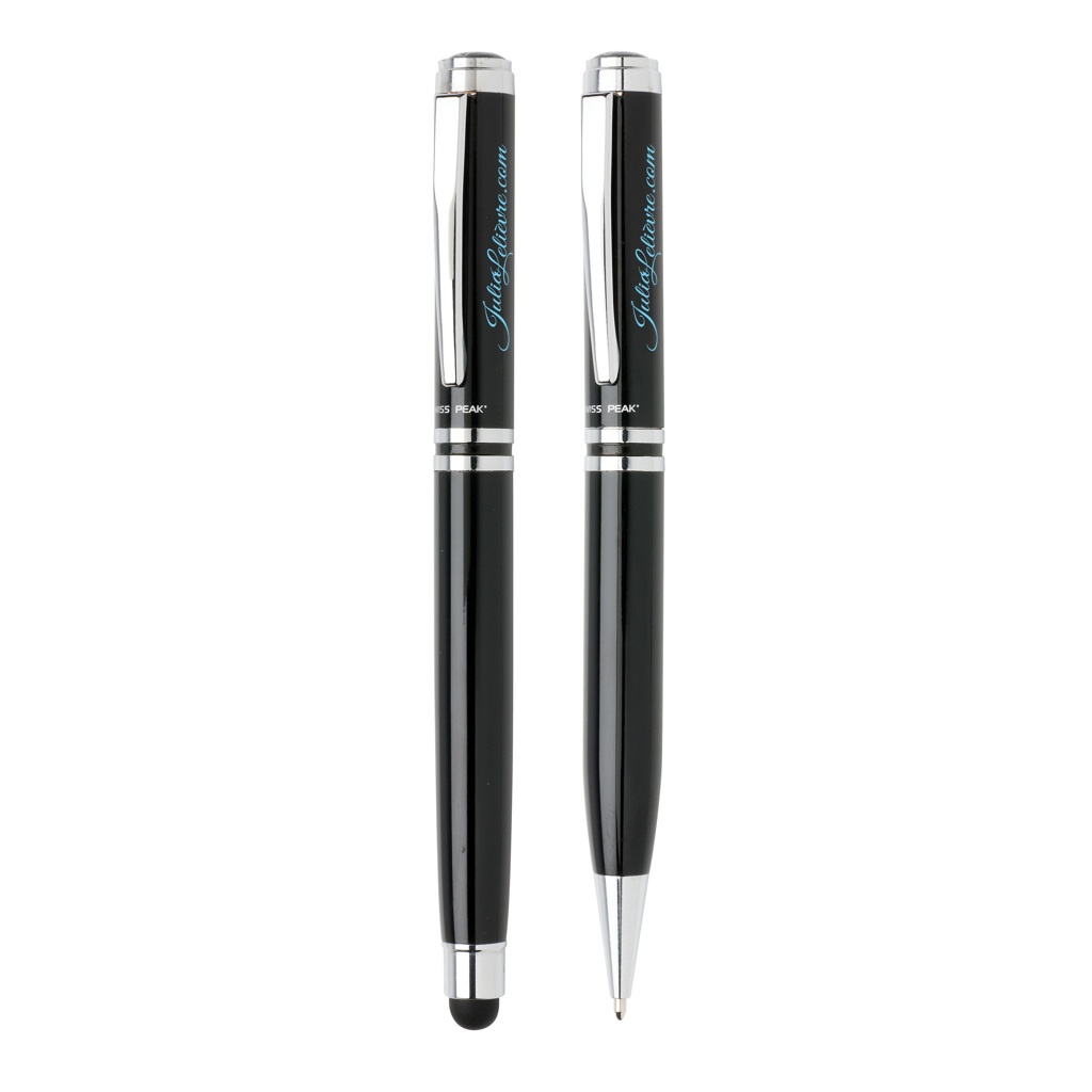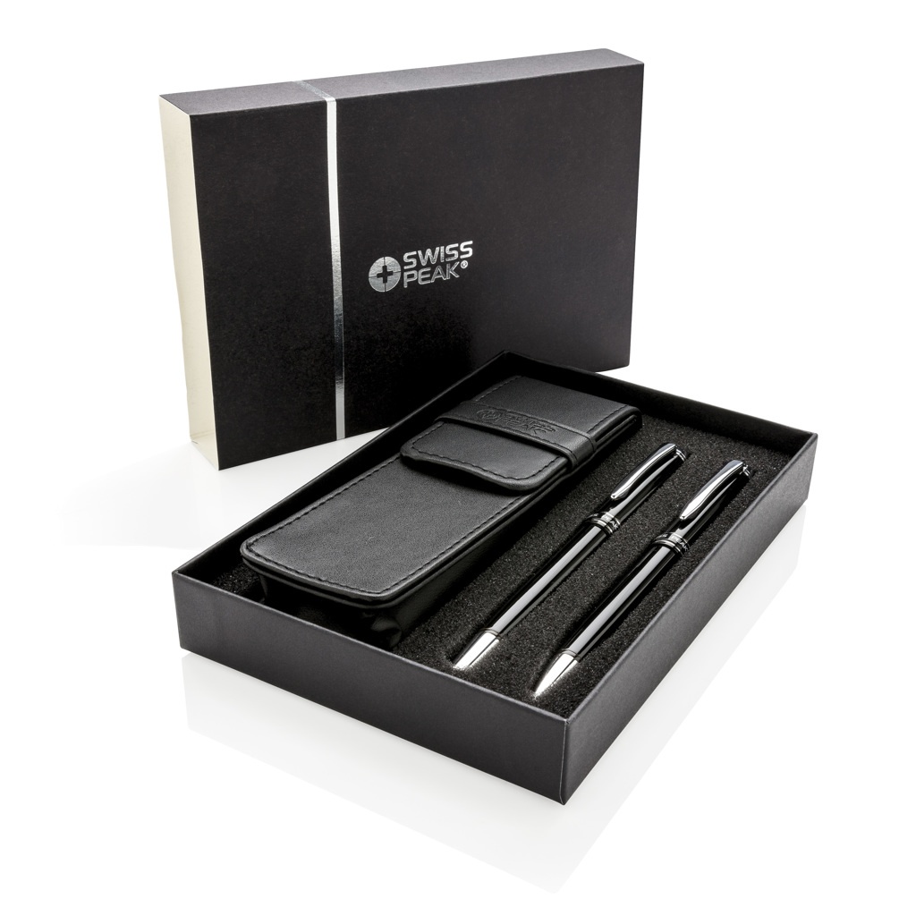 Autentne pliiatsikomplekt, mis kannab kõiki klassikalise kvaliteedi tunnuseid. Kvaliteetne raske messingist metallist rullpall pliiatsi ja pastapliiatsiga Swiss Peak kaubamärgiga. Kaasa arvatud esmaklassiline PU-nahast kott ja kinkekarp. Sinine tint.