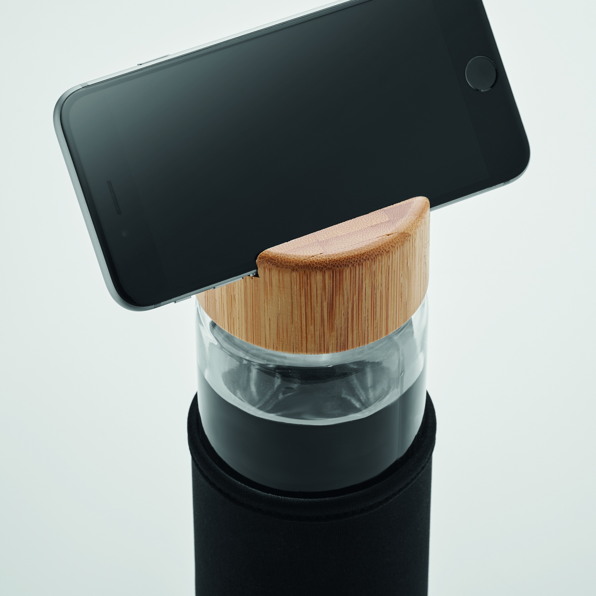 Klaaspudel neopreenist varruka, bambusest kaane ja nutitelefoni aluse funktsionaalsusega. Lekkevaba. Mahutavus: 600 ml. Bambus on looduslik toode, ühe eseme värvis ja suuruses võib esineda väikesi erinevusi, mis võivad mõjutada lõppviimistlust.