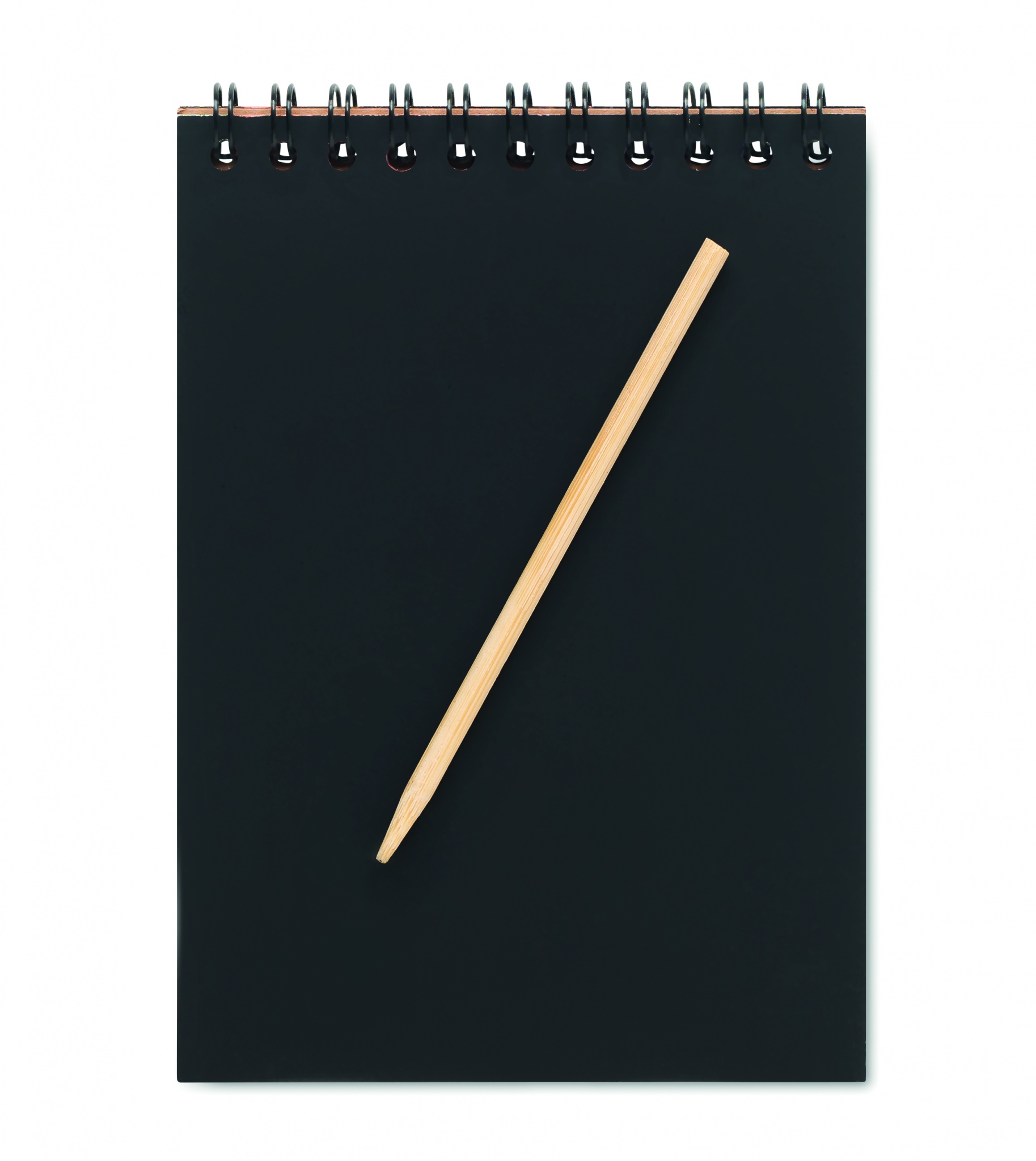 Rõngas jõupaberist märkmik, mis sisaldab 10 musta kraapimislehte ja puidust pliiatsit.