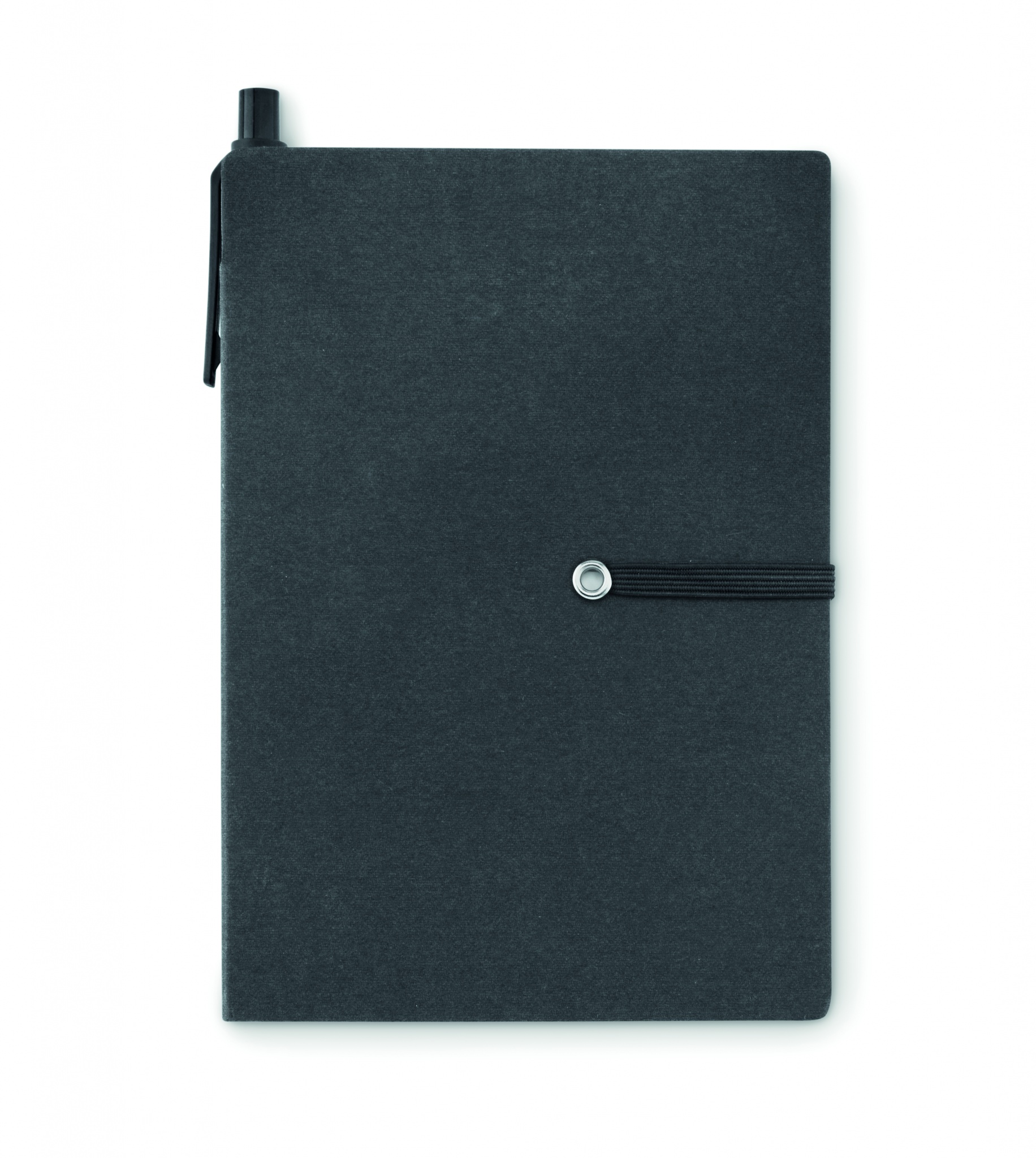 Taaskasutatud kartongist märkmik kleepuva märkmeploki ja pliiatsiga. Pehme taaskasutatud pappkaanega märkmik. Casebound. 140 joonelist lehte (70 lehte). Suured ja keskmised märkmeplokid ja 4 erinevat värvi lehemarkerit. Sobiv nupuga pastakas taaskasutatud karbis ja ABS-detailidega. Must tint. Sobiv elastne sulgemisrihm.