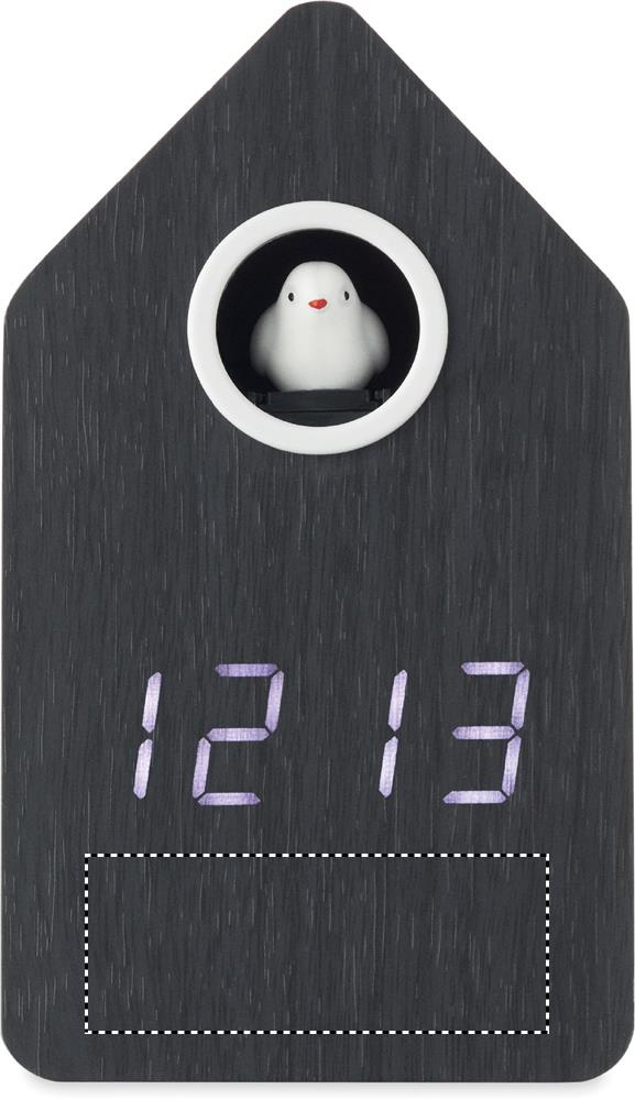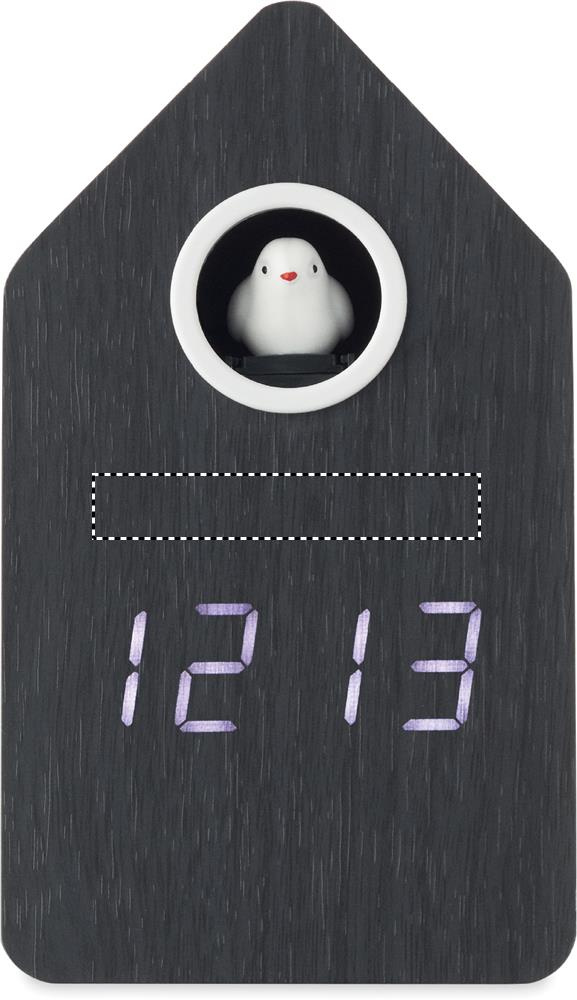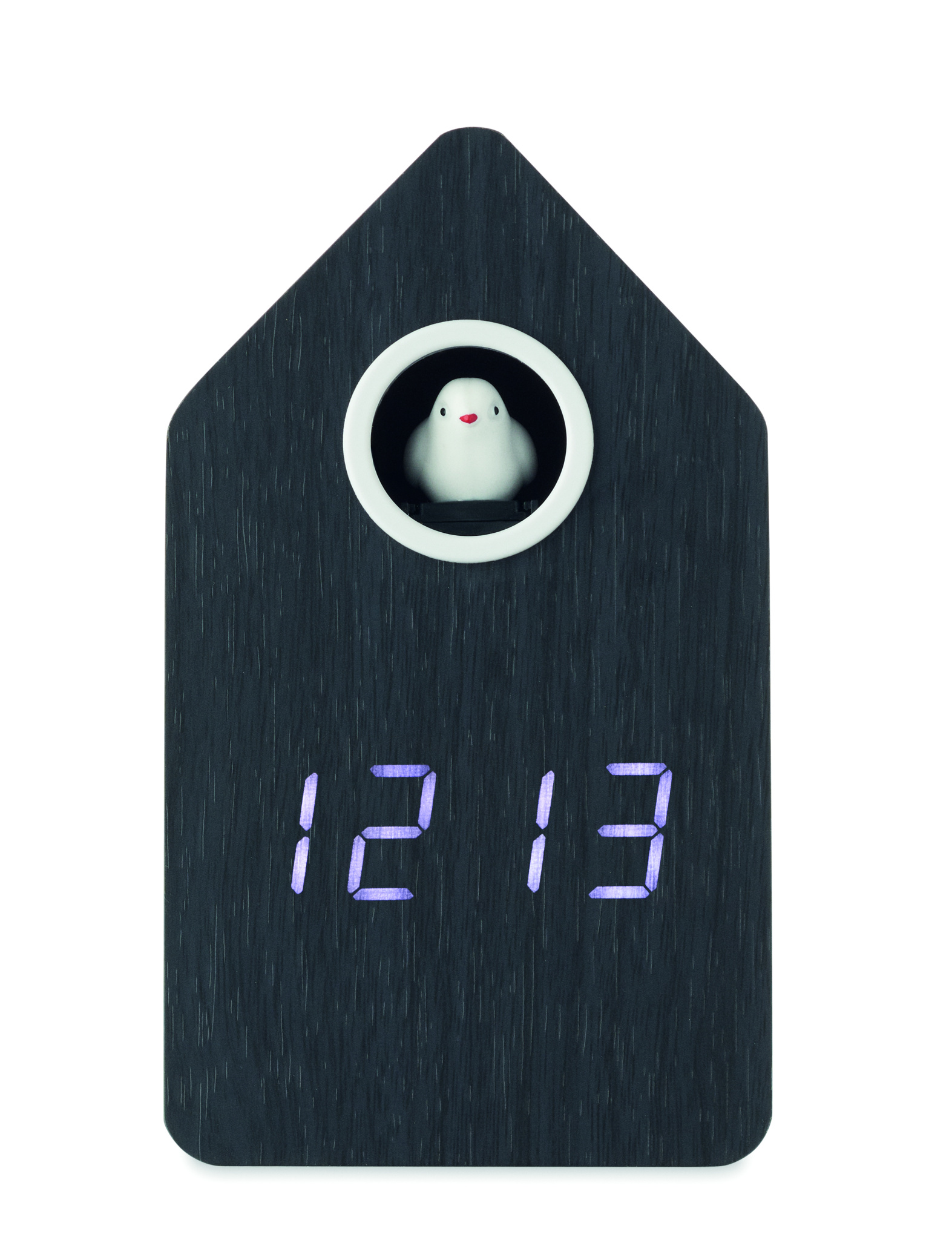 Musta värvi MDF-ist käokell sisseehitatud äratuse/temperatuurinäidikuga. Lind tuleb välja iga täistunni ja äratuse ajal ning sellel on käolinnu hääl. Valge LED-ekraan. Heli vaigistatakse automaatselt kella 22.00 ja 06.00 vahel. 5-minutilised edasilükkamise intervallid.