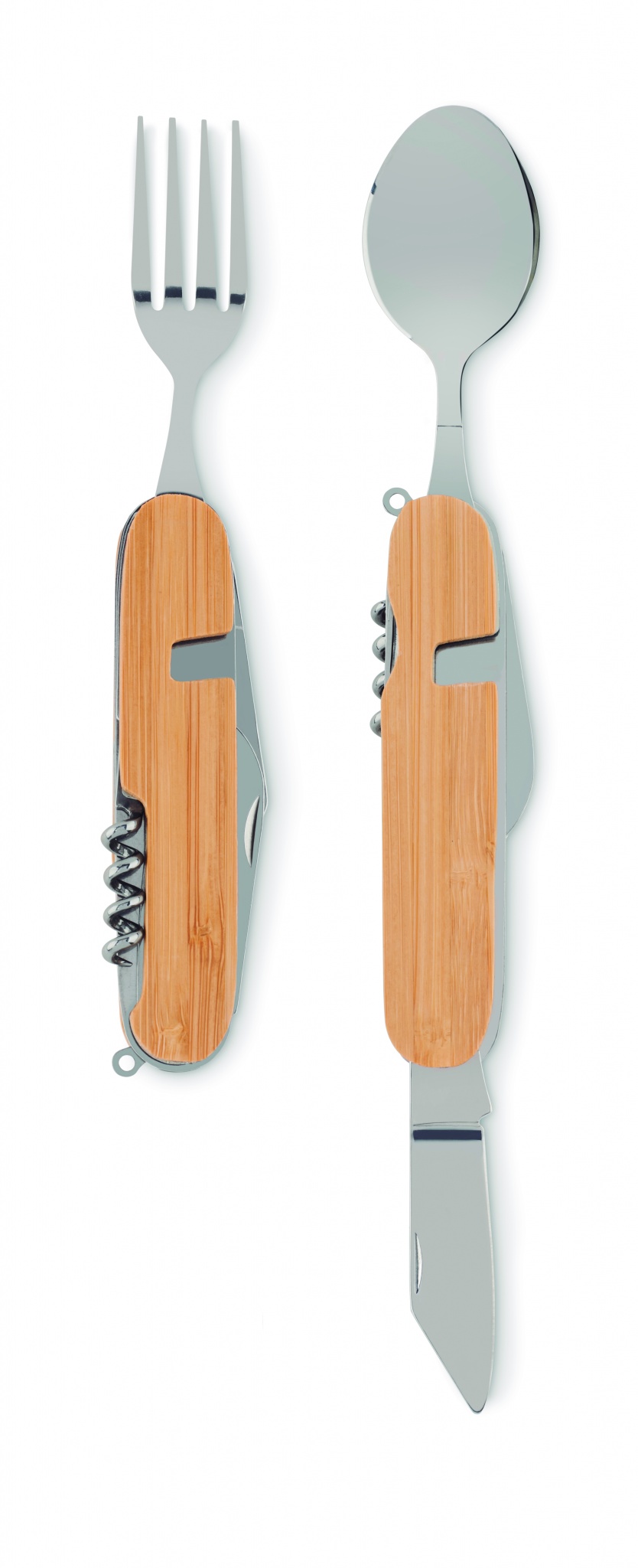 Metallist mitmeotstarbeline kokkupandav matkasöögiriistade komplekt puidust korpuses. 5 funktsiooni. Kaasas kahvel, lusikas, konserviavaja, veiniavaja ja nuga. Saate tükid eraldada kaheks.