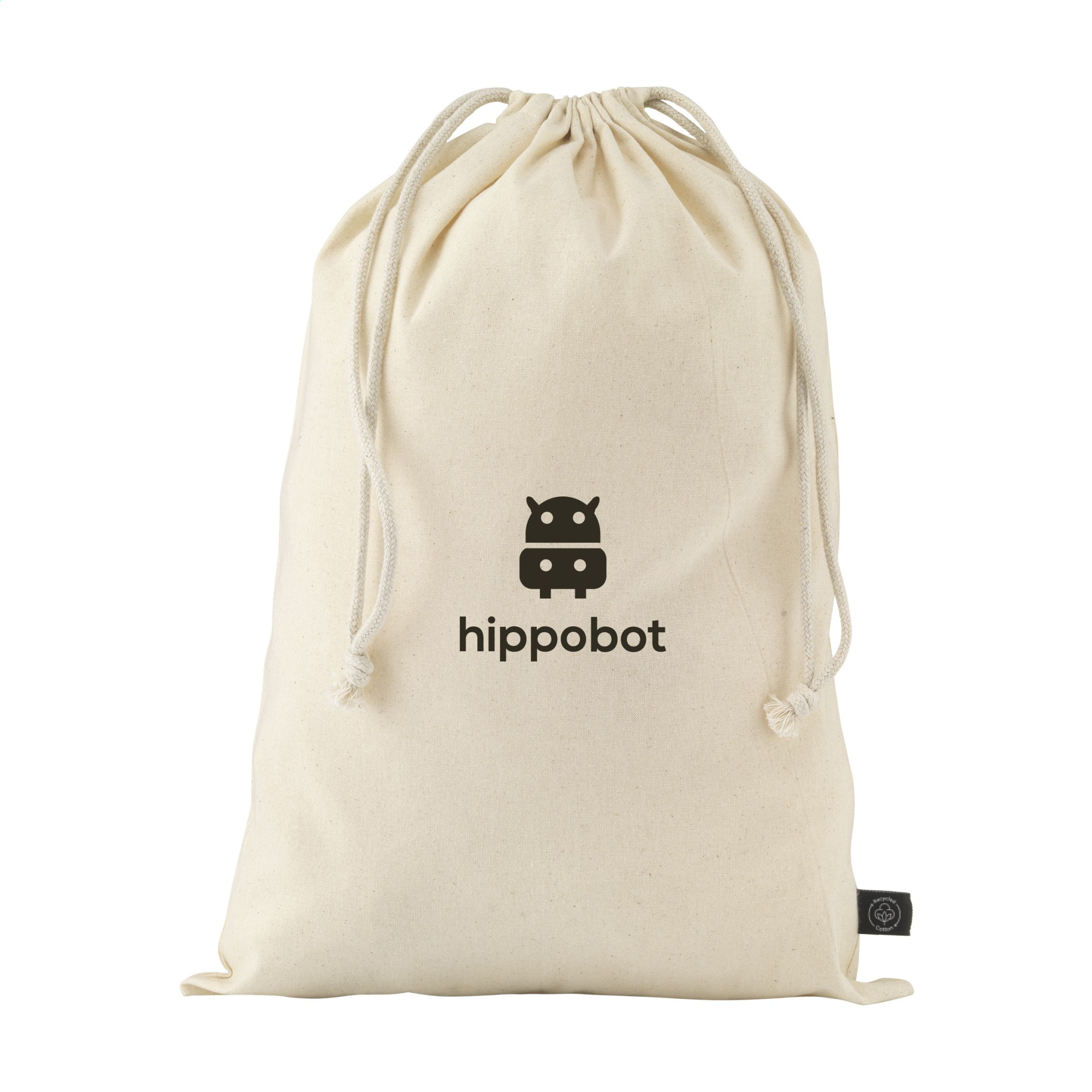Taaskasutatud puuvillast kinkekott (150 g/m²). Taaskasutatud polüestrist ja taaskasutatud puuvillast valmistatud pingutusnööridega. Originaal kinkepakendiks ja sobib esemete hoiustamiseks. GRS-sertifikaadiga. Kokku taaskasutatud materjal: 98%. Mahutavus ca. 4 liitrit.