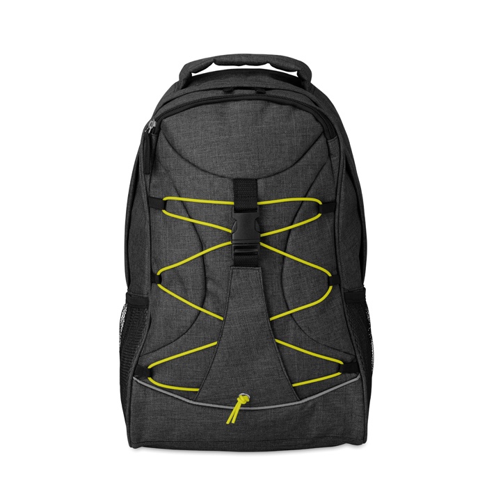 600D 2-toonist polüestrist seljakott, millel on värviline kontrastne pealispind ja helendav esipaneelil olev tumedas nööris. Võrktaskud mõlemal küljel.