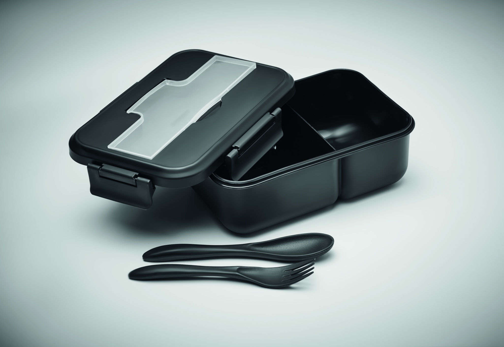 Kahekorruseline PP lõunakarp koos sobiva söögiriistade komplekti ja käepidemega. Kogumaht: 1000 ml
