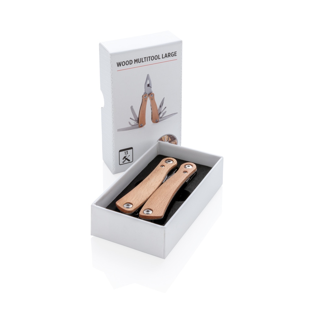Tugev ja vastupidav 13 funktsiooniga multitööriist. Pöögipuidust korpuse ja kvaliteetsete roostevabast terasest tööriistadega. Tööriistade hulka kuuluvad: pika otsaga tangid, standardsed tangid, traadilõikurid, sakiline tera, pudeliavaja, suur lame kruvikeeraja, ristkruvikeeraja, nuga, saag, väike lame kruvikeeraja, konserviavaja, keskmine lame kruvikeeraja, viil. Pakitud kinkekarpi.