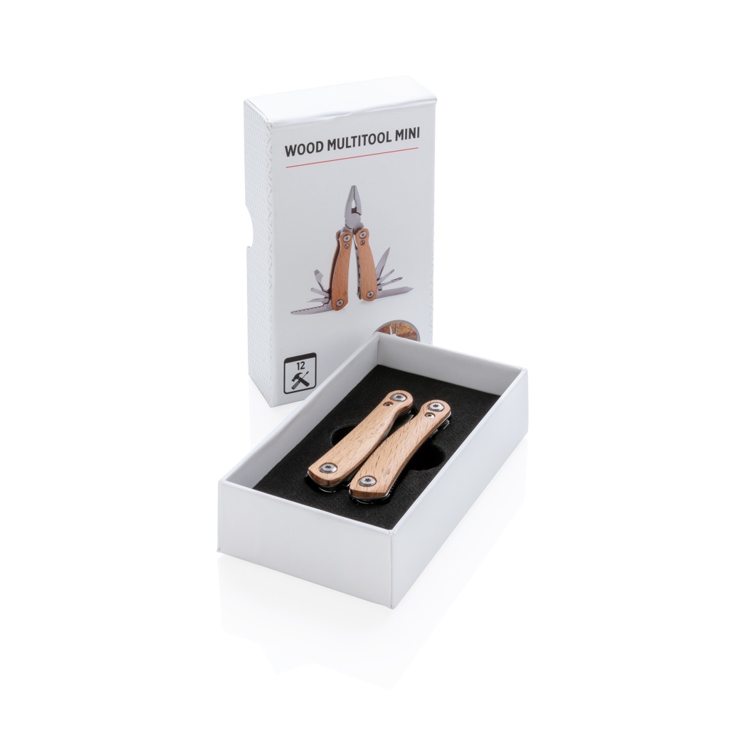 Kompaktne ja vastupidav 12 funktsiooniga multitööriist. Pöögipuidust korpuse ja kvaliteetsete roostevabast terasest tööriistadega. Tööriistade hulka kuuluvad: pika ninaga tangid, tavalised tangid, traadilõikurid, sakiline tera, väike nuga, keskmine lame kruvikeeraja, pudeliavaja, suur lame kruvikeeraja, nuga, väike lame kruvikeeraja, ristkruvikeeraja, viil ja puhasti. Pakitud kinkekarpi.