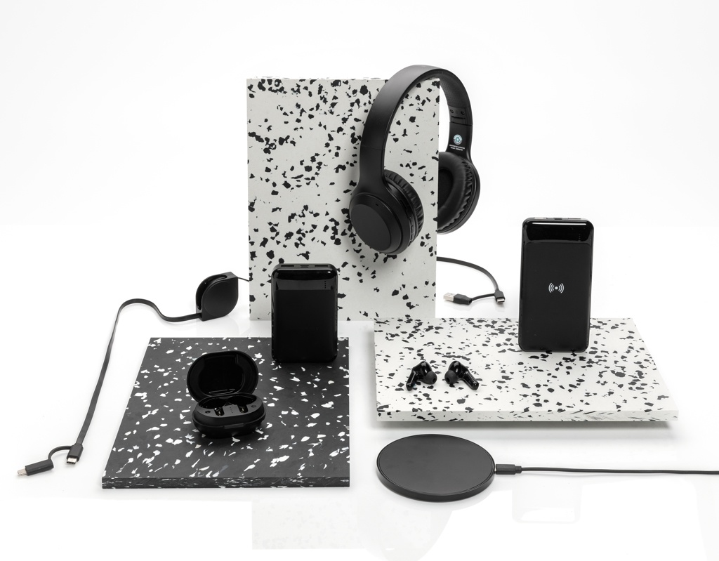 Kokkupandavad juhtmevabad kõrvaklapid, mille ümbris on valmistatud RCS-sertifikaadiga taaskasutatud ABS-plastikust. RCS (Recycled Claim Standard) on standard toote ringlussevõetud sisu kontrollimiseks kogu tarneahelas. Taaskasutatud kogusisaldus: 65% eseme kogukaalust. Juhtmeta kõrvaklapid kasutavad BT 5.0, et tagada ülisujuv ühendus ja kauakestev esitusaeg. Kõrvaklappide disain võimaldab täiuslikku helielamust. Sisseehitatud 200 mAh liitumaku võimaldab mängida kuni 6 tundi ja seda saab täielikult laadida 1,5 tunniga. Töökaugus kuni 10 meetrit. Mikrofoni ja pick-up funktsiooniga. Toode ja tarvikud on PVC-vabad. Kaasa arvatud PVC-vaba ringlussevõetud TPE materjalist laadimiskaabel.