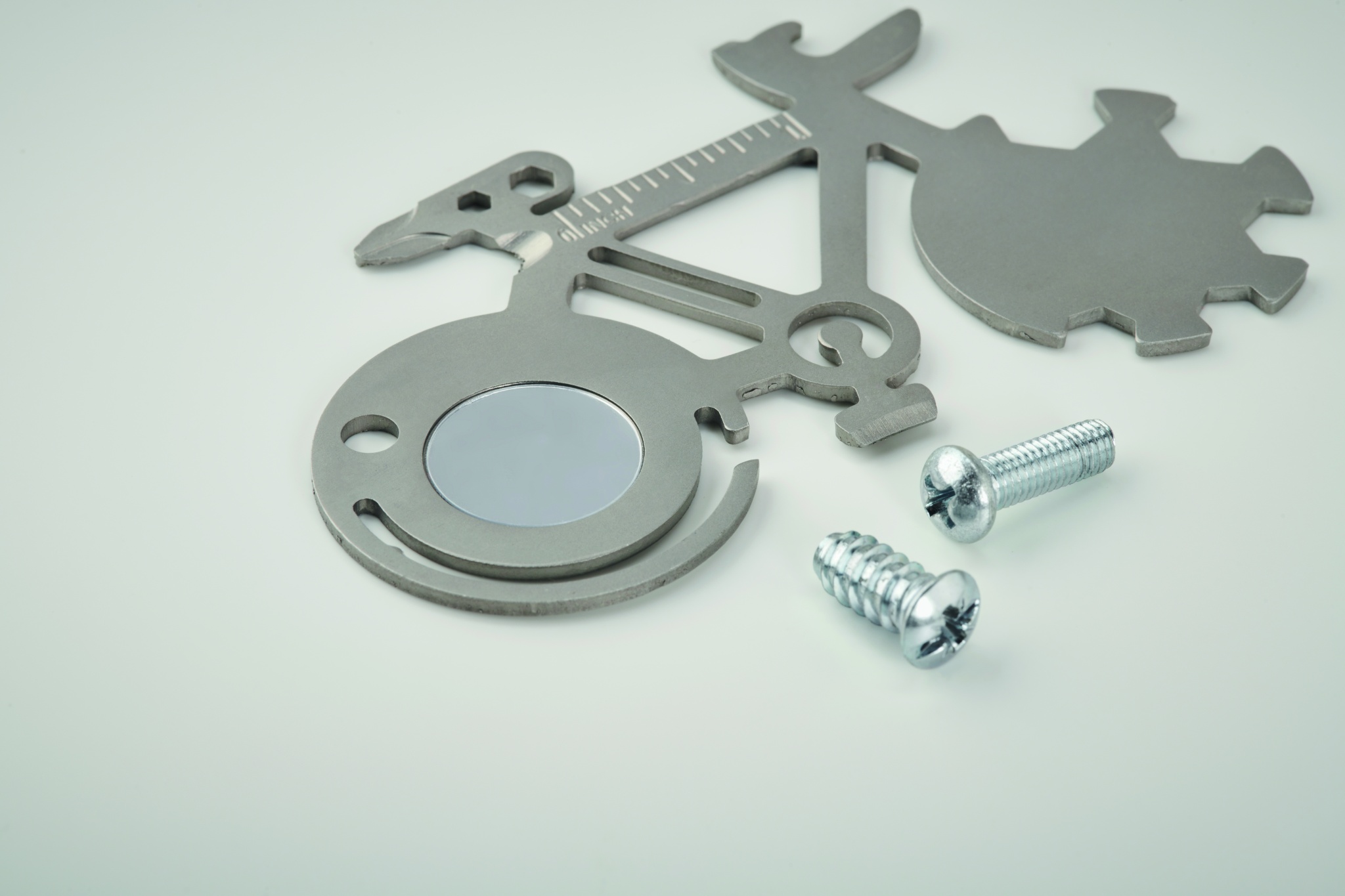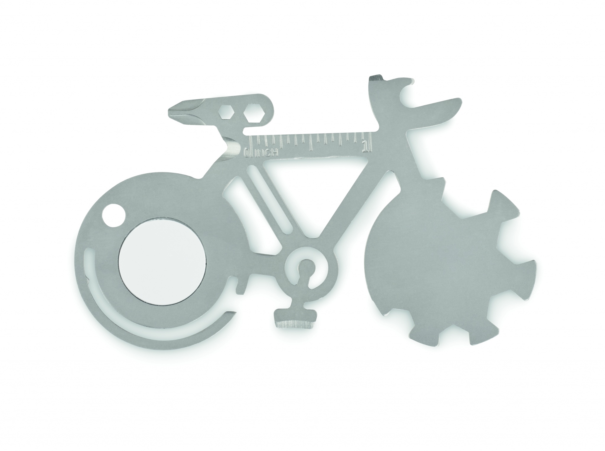 Mitme tööriistaga 11-ühes roostevabast terasest jalgratta kujuline. Pudeliavaja, noa, joonlaua või Phillipsi kruvikeeraja tööriistadest.