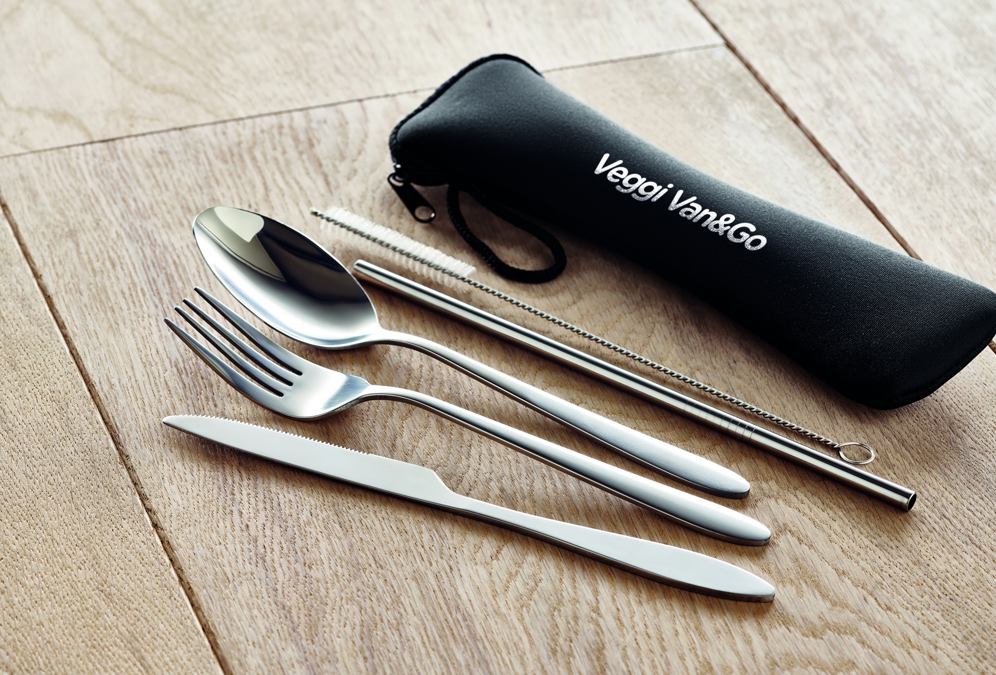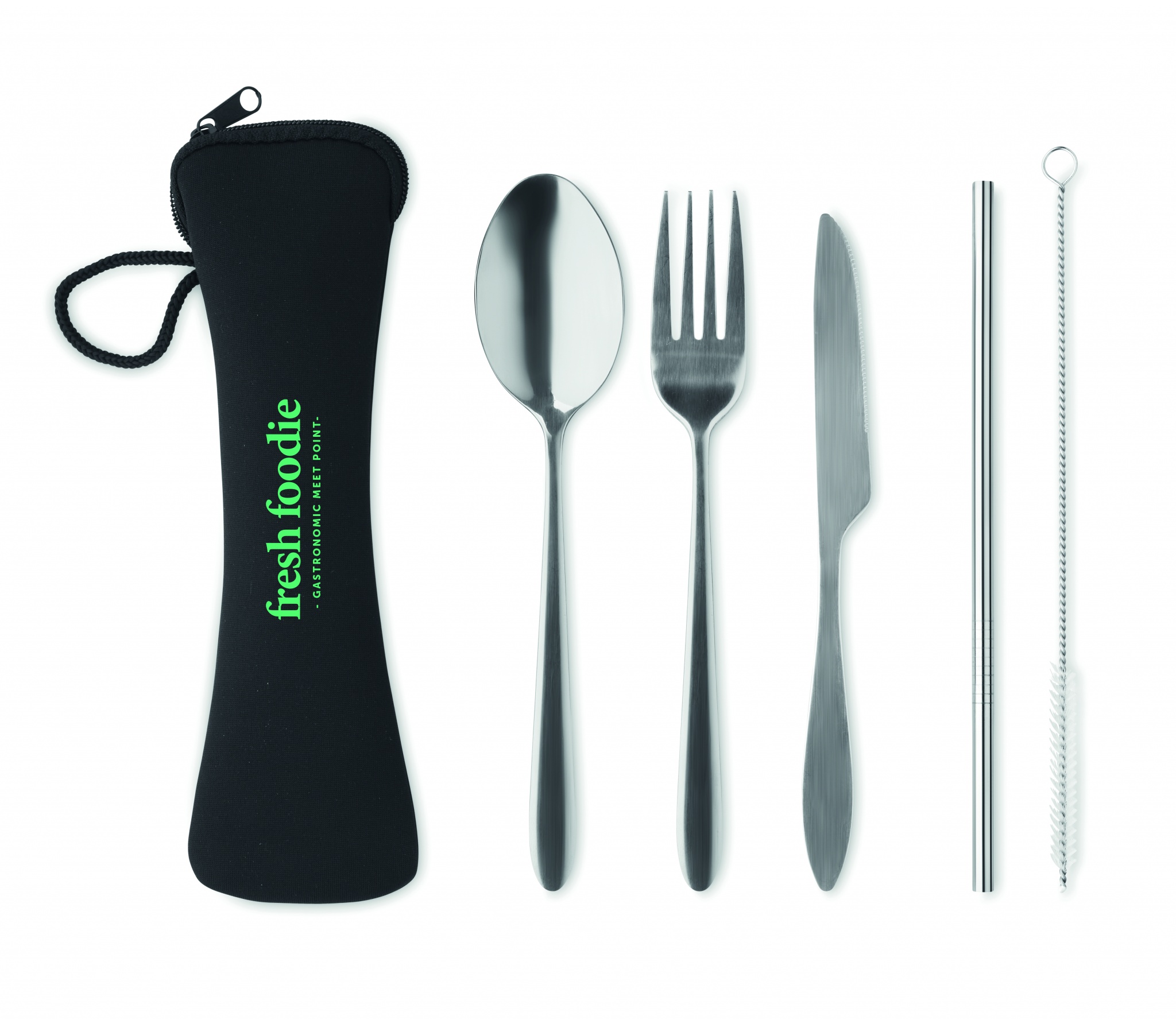 Korduvkasutatav roostevabast terasest söögiriistade komplekt, mis sisaldab kahvel, nuga, lusikas, õled ja pintsel neopreenkotis.