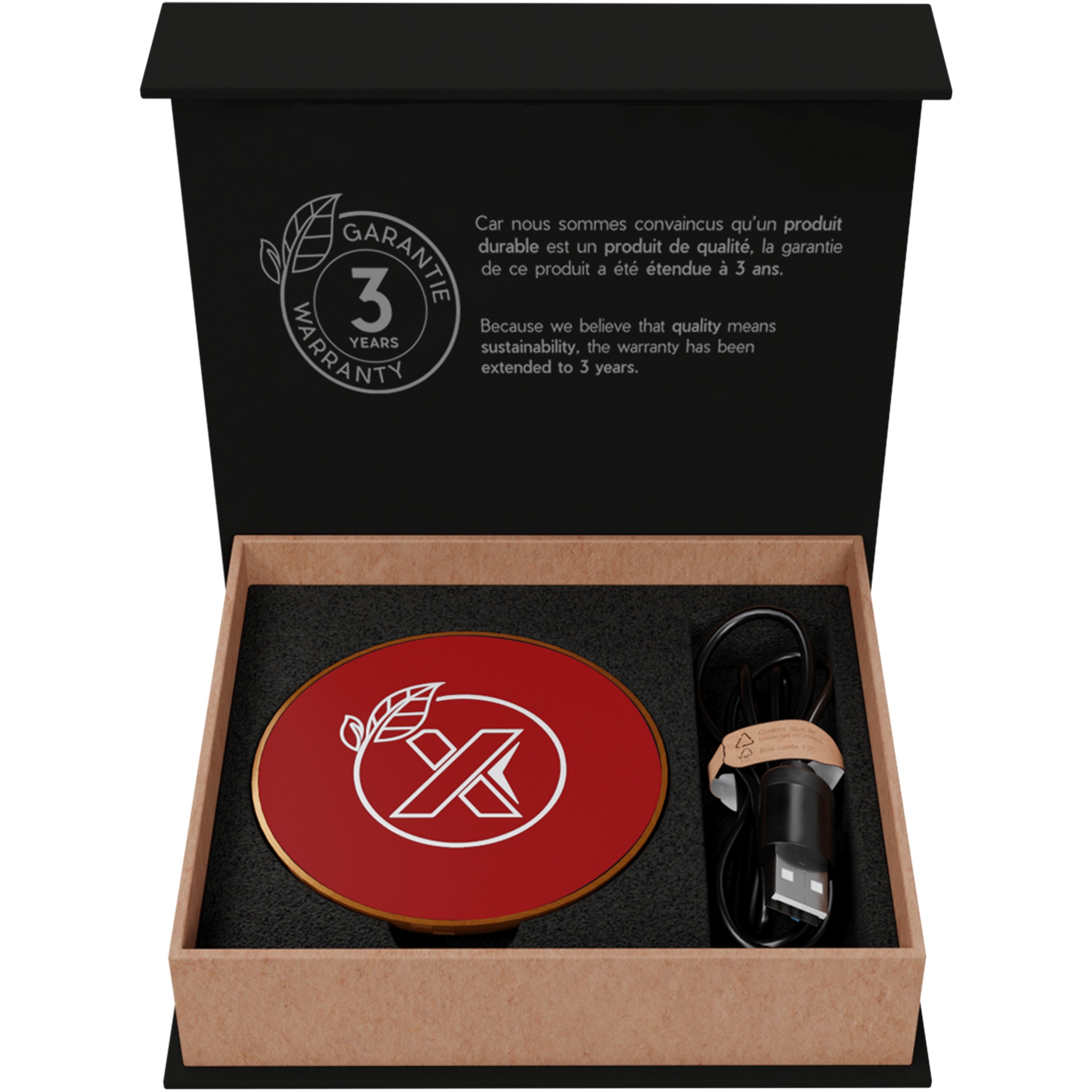 Kummist ja puidust 10W juhtmevaba laadimisjaam ning taaskasutatud PET-plastikust laadimiskaabel. Saab kaunistada valgustava logoga. Tarnitakse taaskasutatud paberist mustas kraft kinkekarbis, millel on magnetiline sulgur. Patent EUROPE EUIPO.