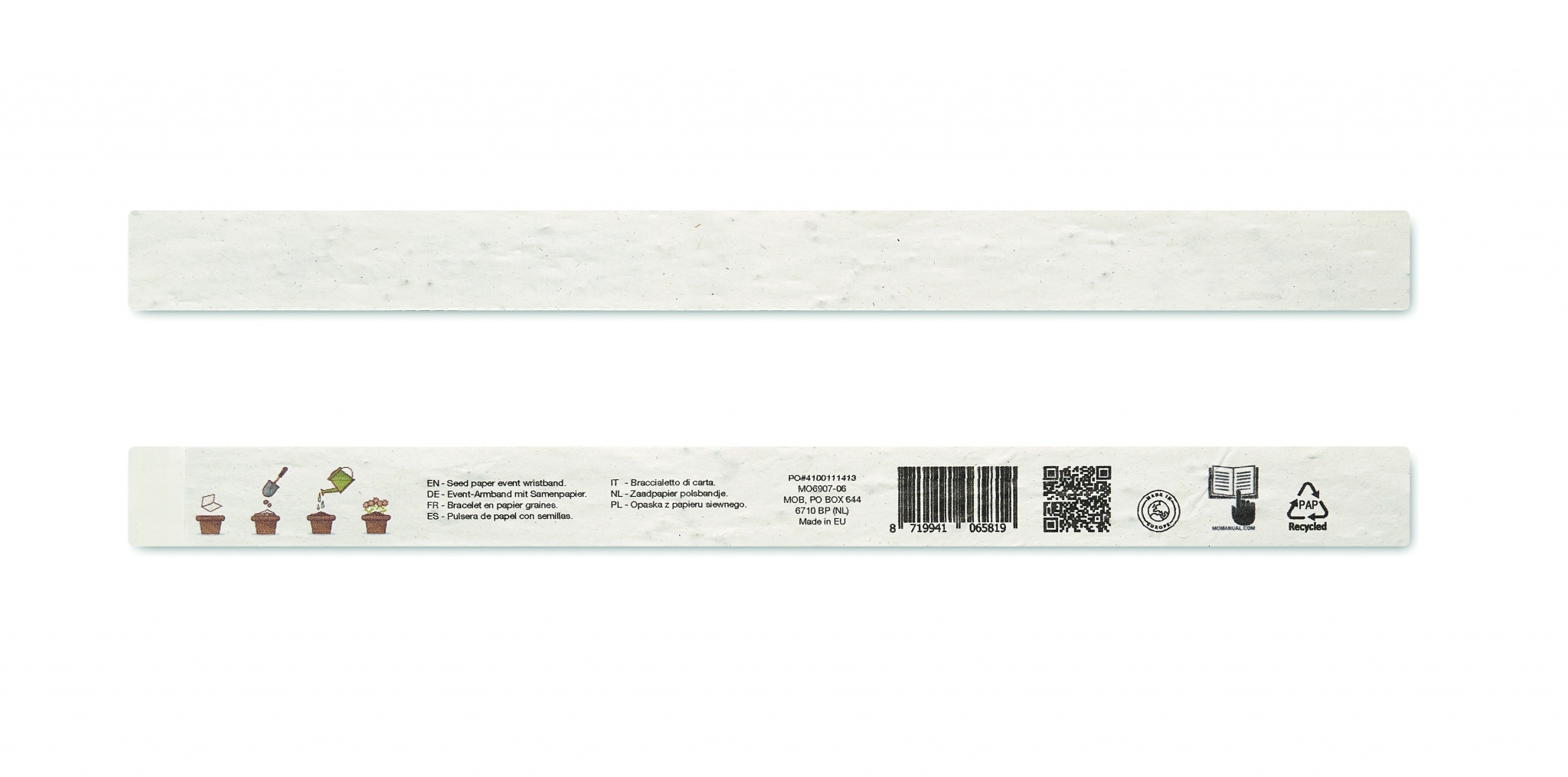 Üks leht 10 ürituse käepaelaga. Metslilleseemnetest taaskasutatud paber. 19mm lai. Valmistatud EL-is.