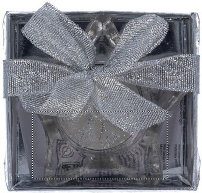 Tähekujuline klaasist teeküünlaalus läbipaistva katte ja dekoratiivpaelaga hõbedases karbis. Komplektis teeküünla.