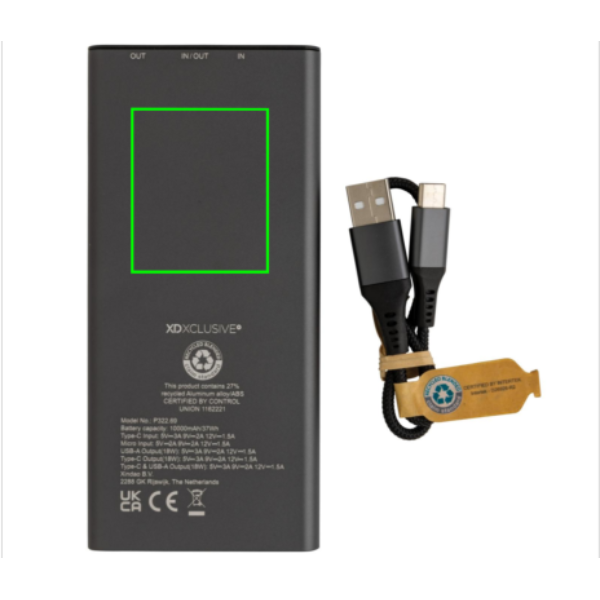 Ülikiire laadimise aku, mis on valmistatud RCS-i (Recycled Claim Standard) sertifitseeritud taaskasutatud alumiiniumist ja ABS-ist. Taaskasutatud kogusisaldus: 27% eseme kogukaalust. RCS-sertifikaat tagab taaskasutatud materjalide täielikult sertifitseeritud tarneahela. Alumiinium ei kaota ringlussevõtu käigus oma omadusi ja seda saab ringlusse võtta lõputult. Akupank sisaldab kauakestvat A-klassi 10 000 mAh liitiumpolümeerakut. C-väljundport toetab kiiret laadimist kuni 18 W ja ka kiiret uuesti laadimist 3 tunni jooksul. Toiteindikaatorid näitavad järelejäänud energiataset, nii et teate alati, millal laadida. Toode ja tarvikud 100% PVC-vaba. Sisaldab C-tüüpi laadimiskaablit, mis on valmistatud RCS-sertifikaadiga taaskasutatud alumiiniumist, TPE-st ja PET-st. Pakitud FSC® segupakendisse. USB väljund 5/3A, 9V/2A. 12V/1,5A. C-tüüpi väljund: 5V/3A, 9V/2A, 12V/1,5A. C-tüüpi sisend: 5V/3A, 9V/2A, 12V/1,5A. Mikro-USB sisend: 5V/2A, 9V/2A, 12V/1,5A.