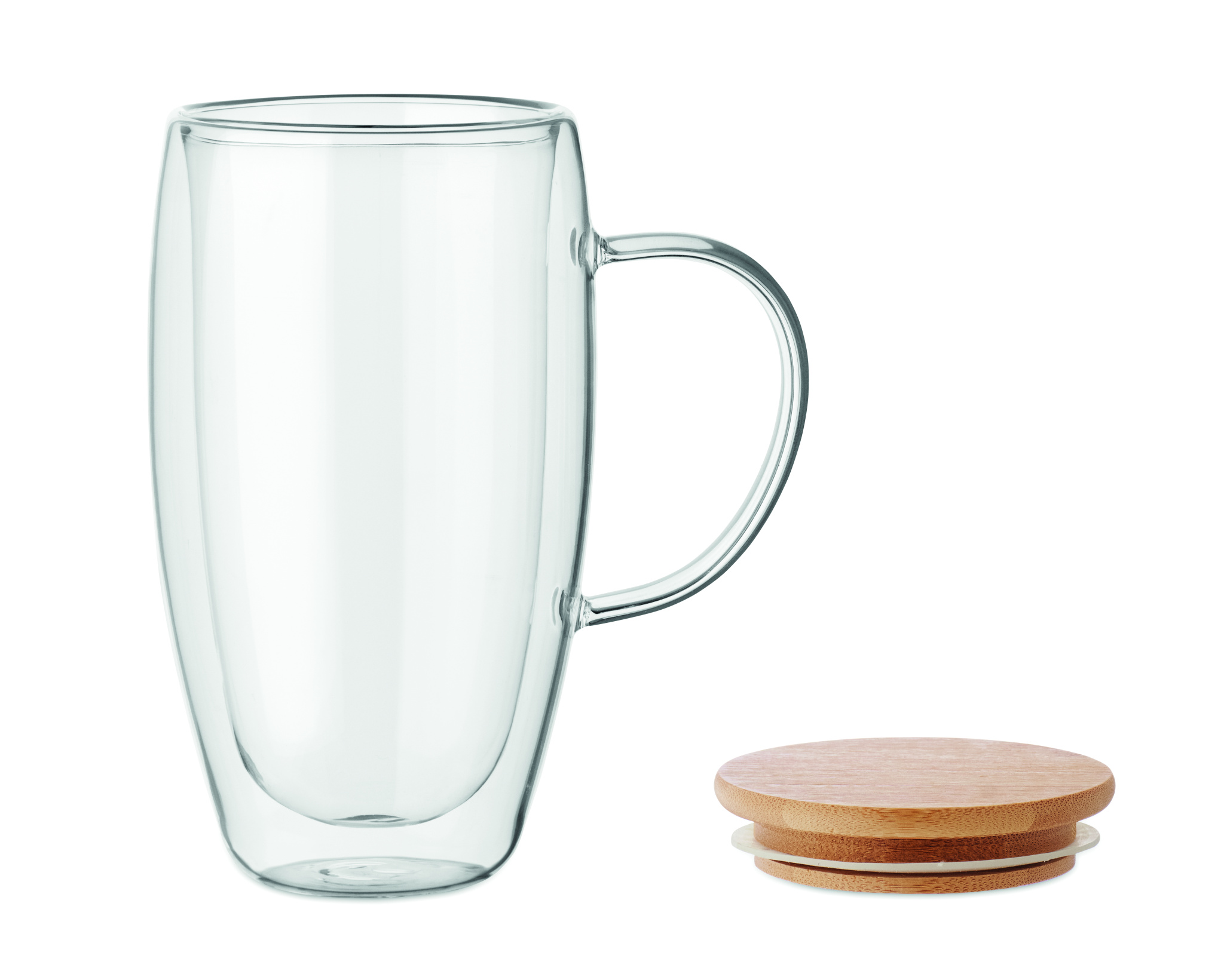 Topeltseinaga borosilikaatklaasist kruus käepideme ja bambusest kaanega. Mahutavus: 450 ml.
