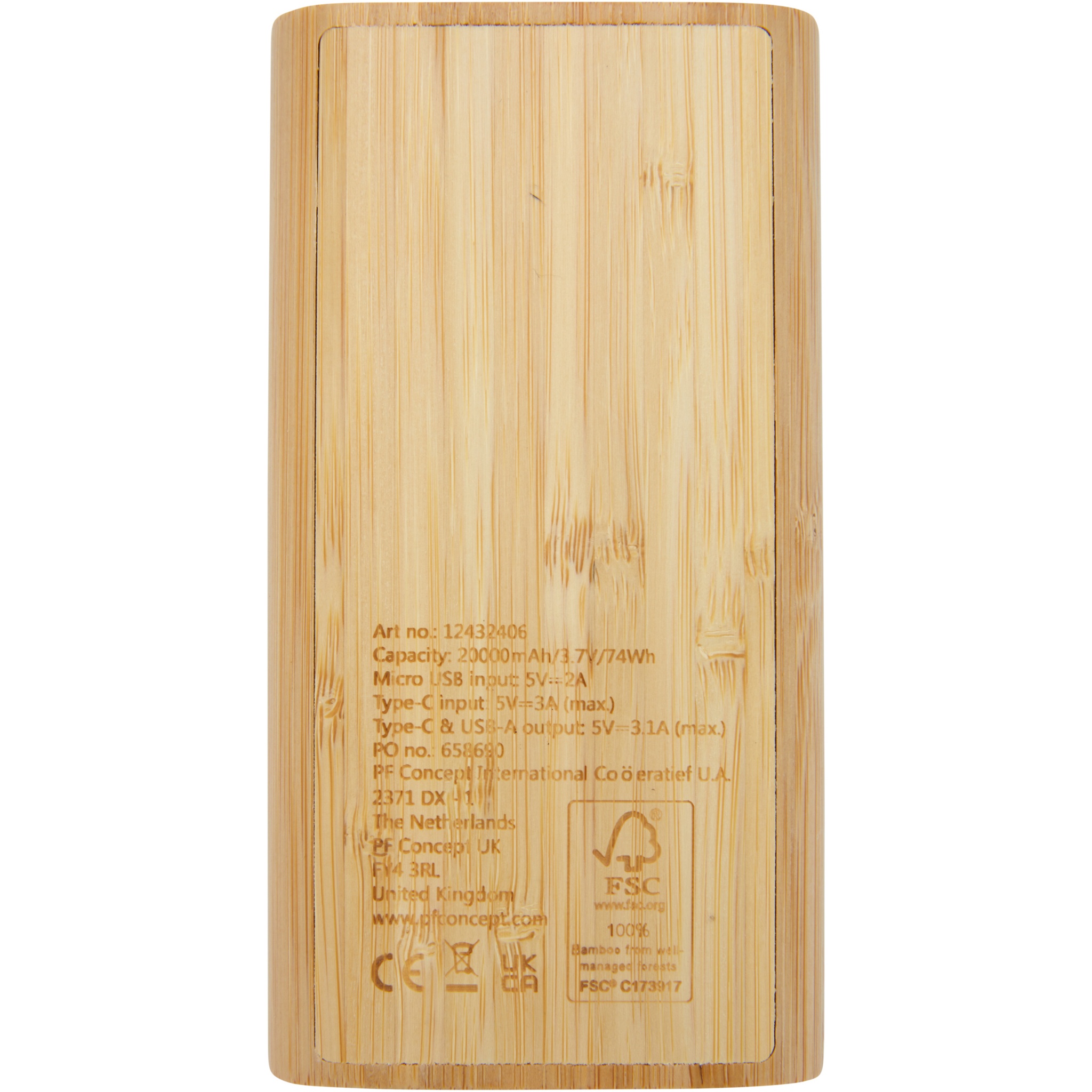 20 000 mAh bambusest akupank, millel on SISSE/VÄLJA puutetundlik nupp ja 4 LED-indikaatorit, mis näitavad järelejäänud aku mahtuvust. Mikro-USB-sisend 5V/2A, C-tüüpi sisend 5V/3A, C-tüüpi väljund max 5V/3,1A, kaks USB-A-väljundit 5V/3,1A max, koguvõimsus 15,5W. Tarnitakse 30 cm TPE 3A Type-C kuni Type-C laadimiskaabli, kasutusjuhendi ja jõupaberist kinkekarbiga. Kuna bambus on looduslik toode, võib ühe eseme värvis ja suuruses esineda mõningaid erinevusi, mis võivad mõjutada lõpptulemust.