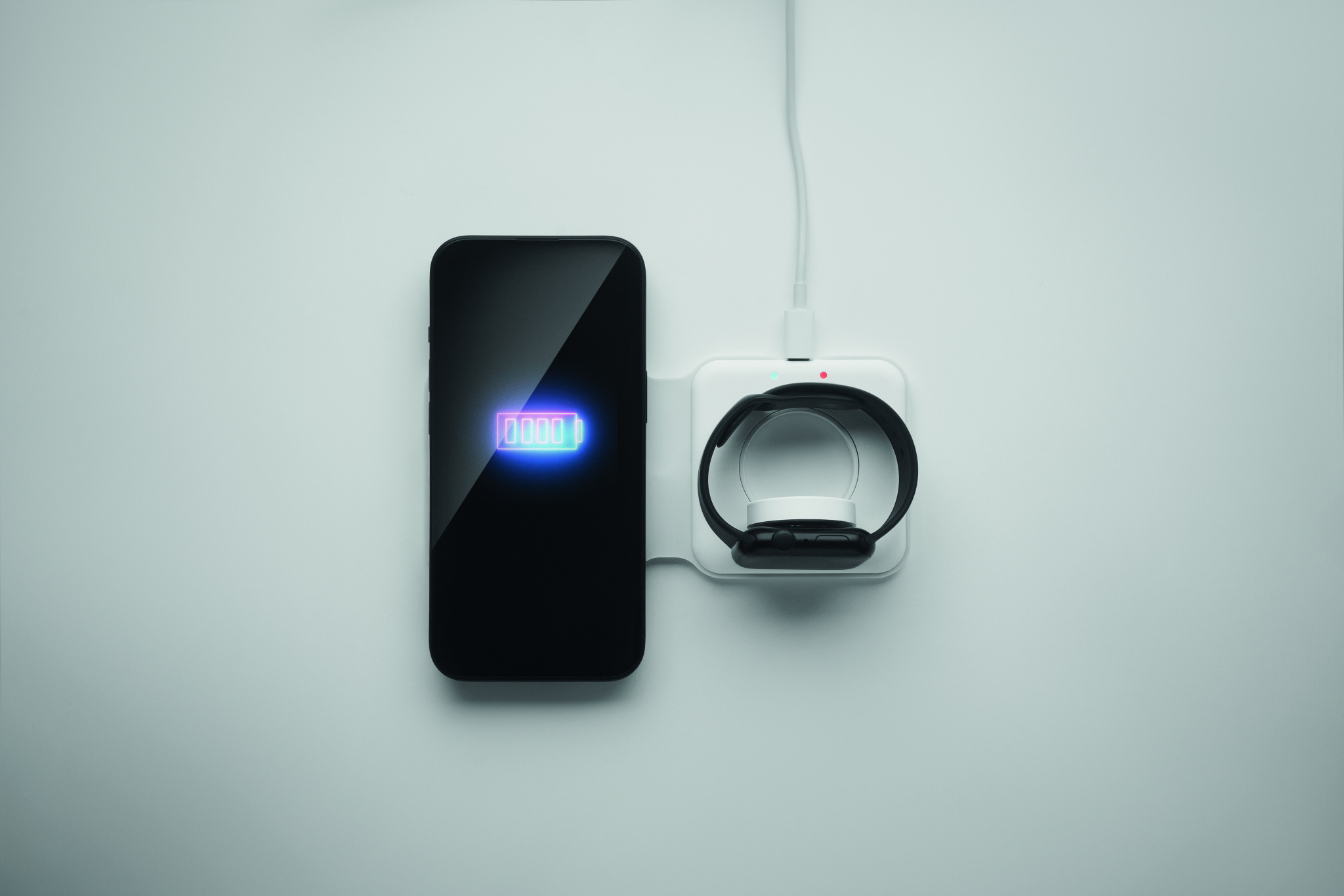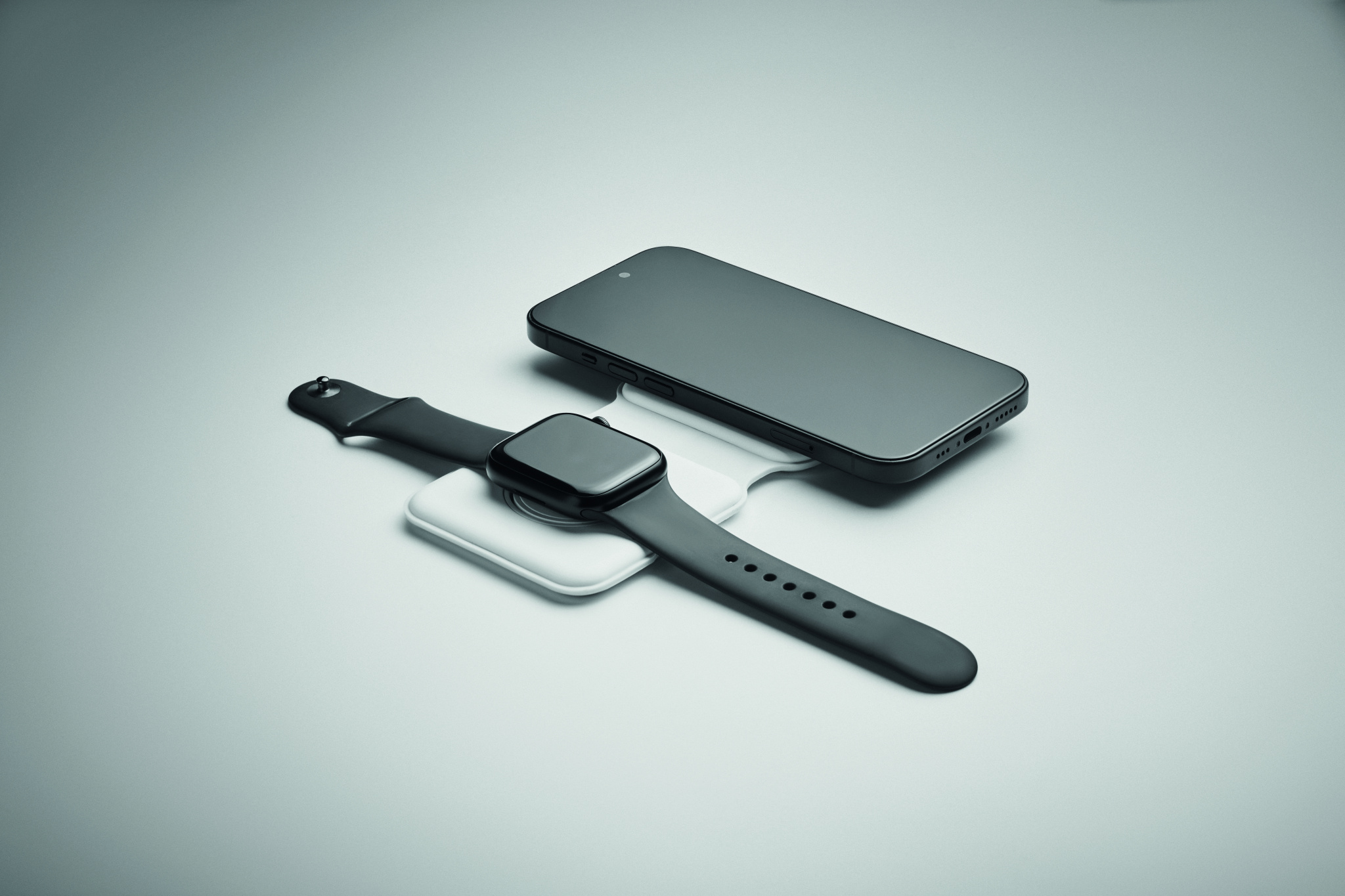 2 in 1 taitettava ABS-latausasema. Se sisältää langattoman 15 W laturin ja älykellon laturin (vain Apple®).