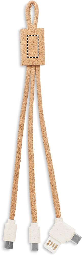 -3-in-1 -latauskaapeli korkkia. Tulo A-tyypin ja C-tyypin liitännällä, lähtö kolmella eri tyypin liitännällä, A-, B- C-tyyppi. Korkki on luonnonmateriaali, strukturaalinen laatu ja pinnan huokoisuus voi aiheuttaa eroavaisuuksia tuotteissa painatuksen jälkeen.