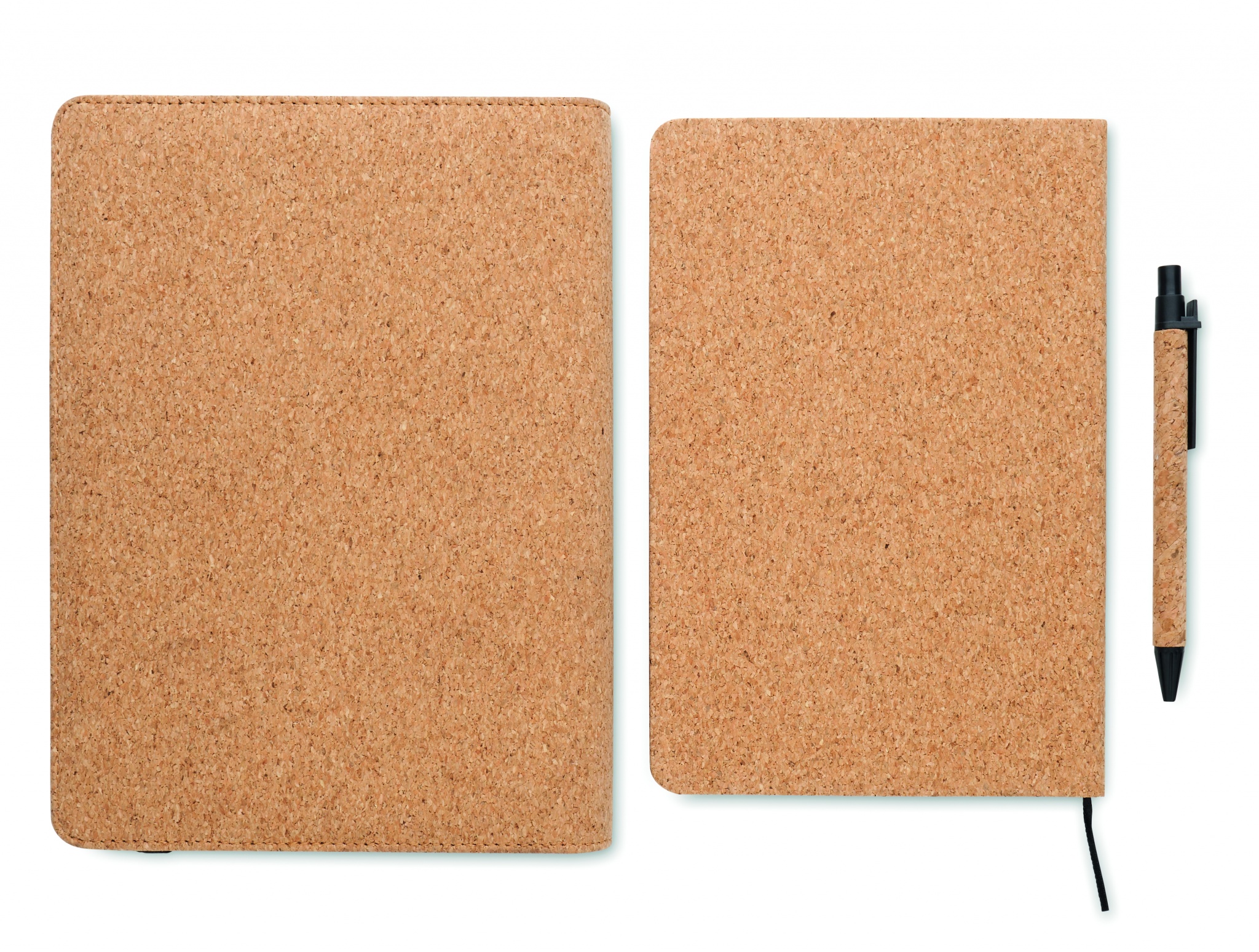 A5-korkkikansio. Vaihdettava A5-muistikirja, jossa on kova korkkikansi. 192 sivua kierrätyspaperista (96 arkkia). Mukana kynä ja sille pidike. 2 korttitaskua ja yksi suuri lokero. Joustava sulkuhihna.