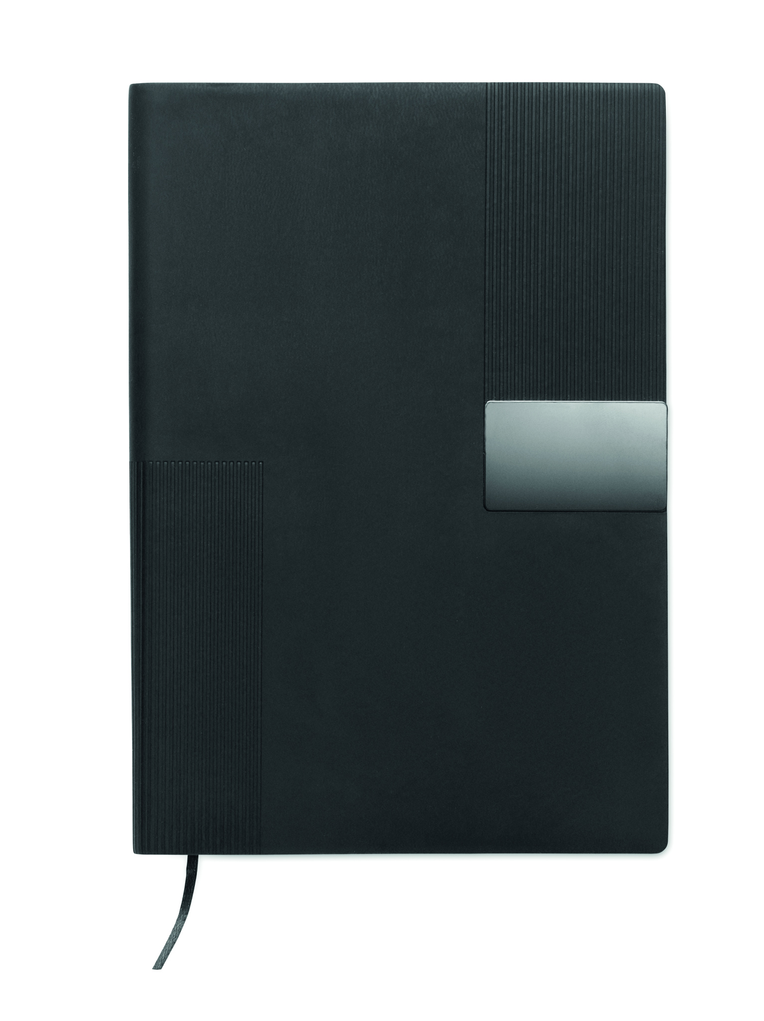 A5-kokoinen PU-muistikirja pehmeäkantisilla kansilla. Nidottu. 160 viivoitettua sivua (80 arkkia) kierrätyspaperista. Yhteensopiva kuminauha ja kirjanmerkkinauha. Metallinen rautakoristelu etupuolella.