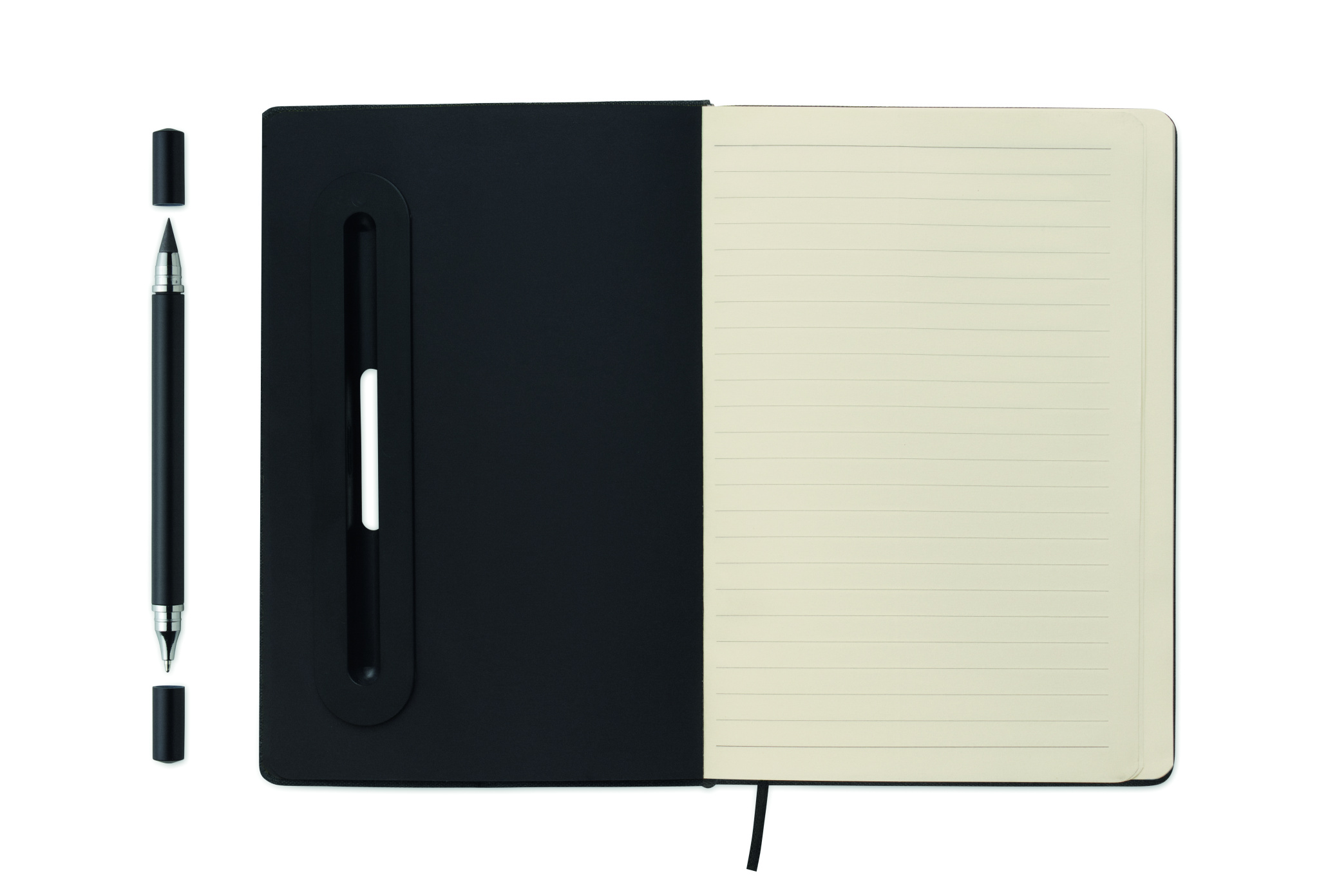 A5-kokoinen muistikirja, jossa on kova RPET-kansi ja puhelinpidike. Integroitu 2-in-1-musteeton ja tavallinen ABS-kuulakärkikynä. Nidottu. 192 viivoitettua sivua kierrätyspaperista (96 arkkia). Yhteensopiva hihna ja kirjanmerkki.