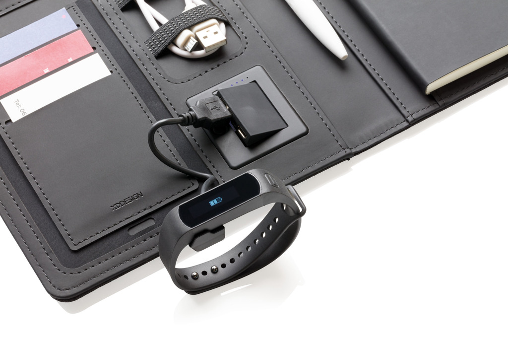 Tämä muistikirjan suoja sisältää irroitettavan muistikirjan (128 viivoitettua sivua, 80 g/m2) sekä uusinta teknologiaa. Etukannessa on langaton latauslaatta puhelintasi varten (Androidin uusimmat mallit, iPhone 8 ja uudemmat.) Vanhemmat puhelimet ja tabletit voidaan ladata USB-porttien kautta 4 000 mAh varavirtalähteen avulla. Ainutlaatuiset USB-portit avautuvat napin painalluksella. Tuloteho: 5,0 V / 1,0 A Lähtöteho: 5,0 V / 2,1 A Langaton lähtöteho: 5 W Rekisteröity design®