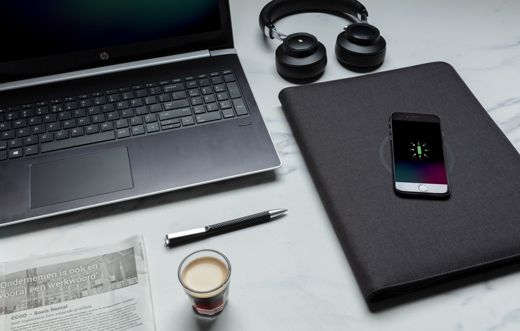 Tämä A4 portfolio, jossa on 20 kermanväristä viivoitettua 70 gramman paperiarkkia muistiona, edustaa uusinta tekniikkaa. Etukannessa on langaton latausalusta puhelintasi varten. (Androidin uusimmat sukupolvet, iPhone 8 ja uudemmat.) Vanhemmat puhelimet ja tabletit voidaan ladata USB-liitäntöjen kautta 5 000 mAh varavirtalähteen avulla. Sisääntulo: 5,0 V/2,1 A. Ulostulo 1: 5,0 V/2,1 A. Ulostulo 2: 5,0 V/2,1 A. Langaton ulostulo: 5W. Rekisteröity malli®