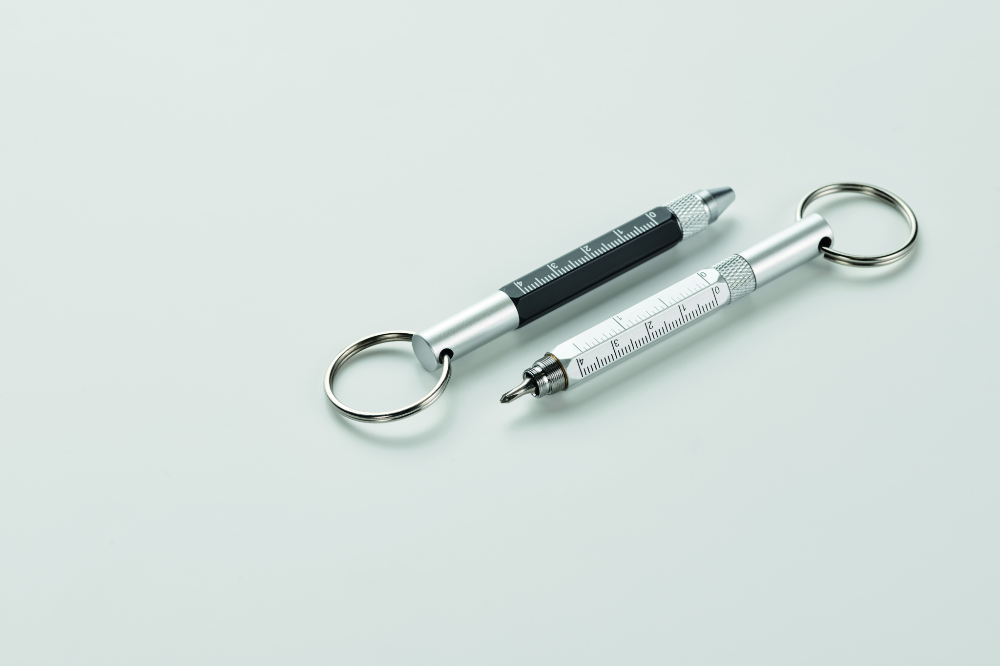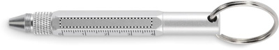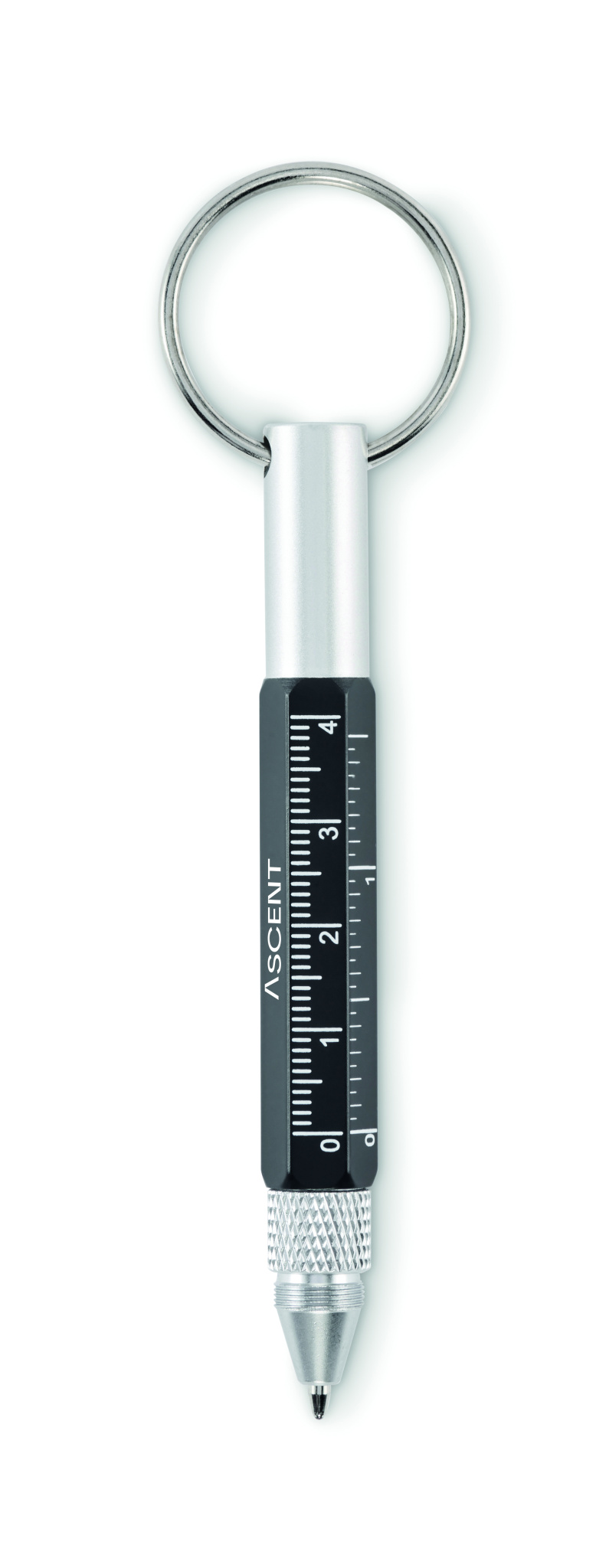 Kierrätetystä alumiinista valmistettu avaimenperä, jossa kierrekynä, 4 cm/1,5 tuuman viivain, kynä ja 2 in 1 -ripustetta sekä litteäpäinen ruuvimeisseli. Musta muste.