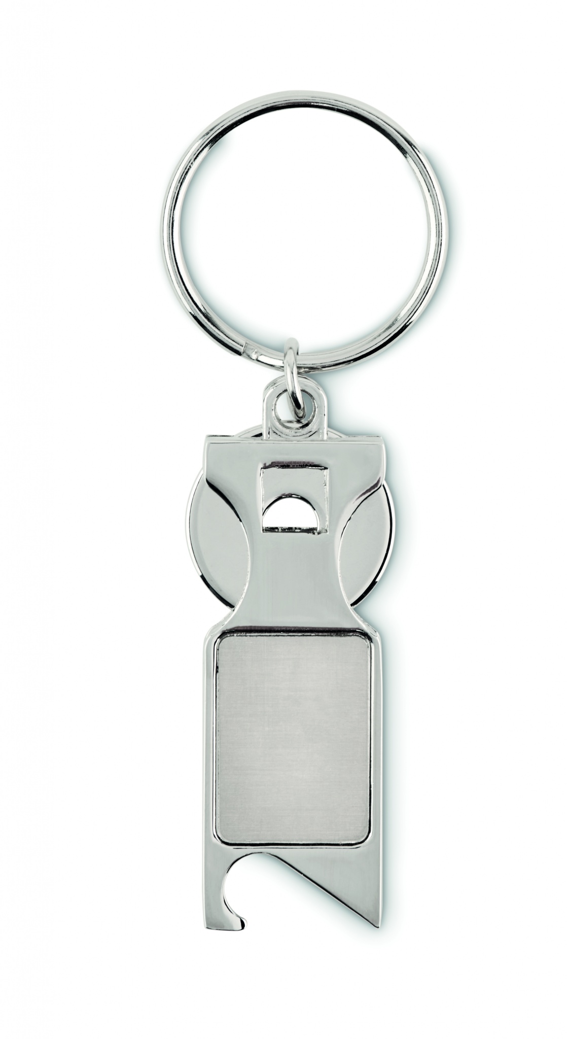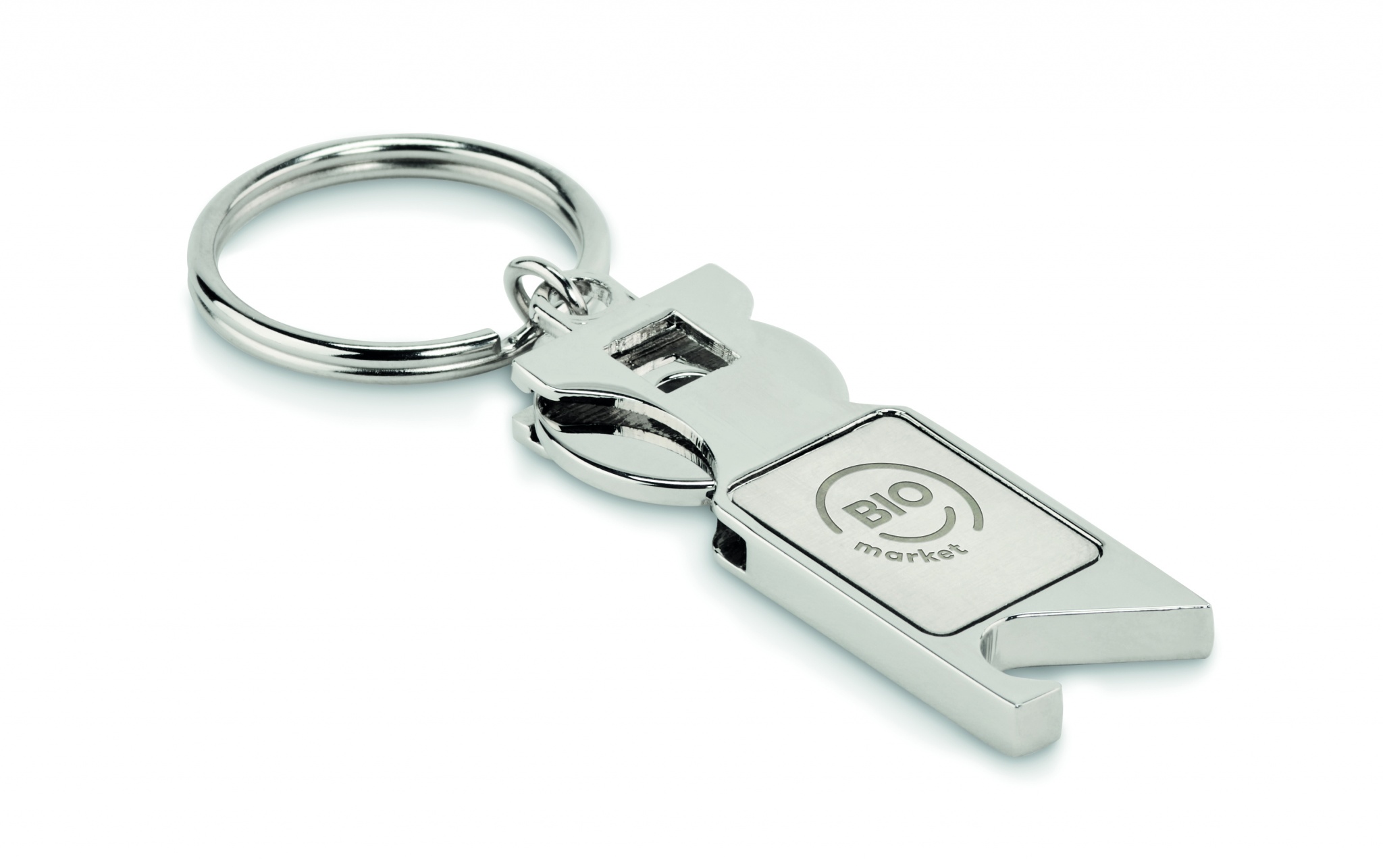 Sinkkiseoksesta valmistettu avaimenperä, jossa euron kokoinen metallipoletti ja pullonavaaja.