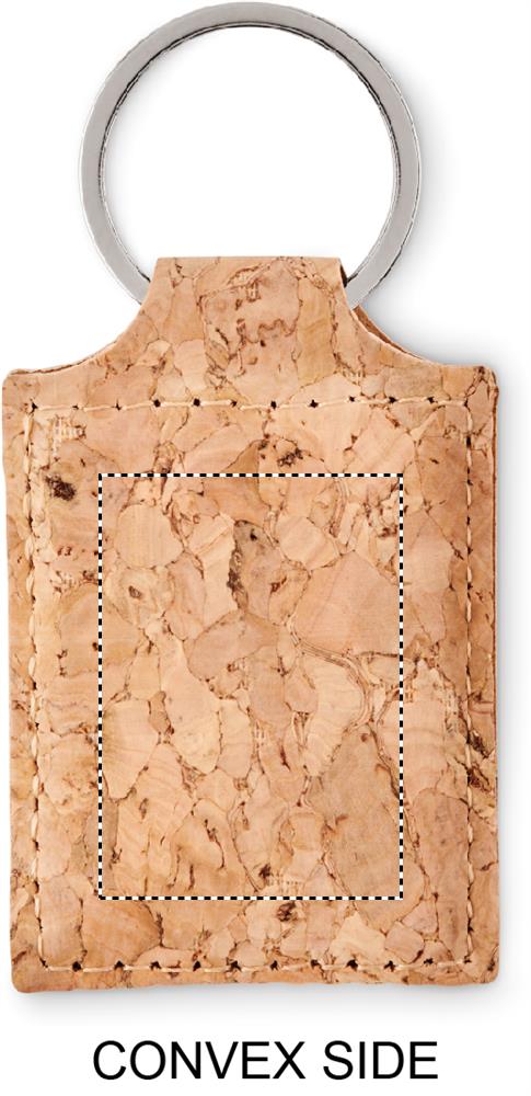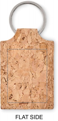 Suorakulmainen korkista tehty avaimenperä. Korkki on luonnonmateriaali, strukturaalinen laatu ja pinnan huokoisuus voi aiheuttaa eroavaisuuksia tuotteissa painatuksen jälkeen.